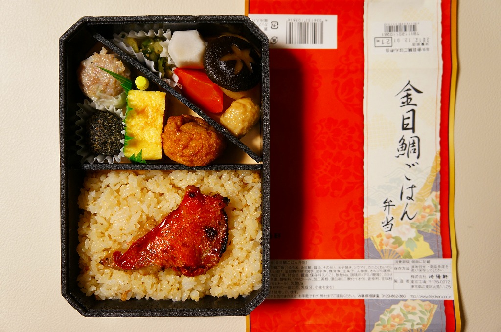 商品名を書いた赤い掛紙に包まれる、黒い長方形の容器の中身は、キンメダイの照焼を載せた炊込飯、カニしんじょう揚、玉子焼、サトイモやシイタケなどの煮物、鴨入り鶏肉団子、野沢菜漬、ごまのおはぎ、特製シウマイ1個など。味も見栄えも締まる、とても美しいお弁当。