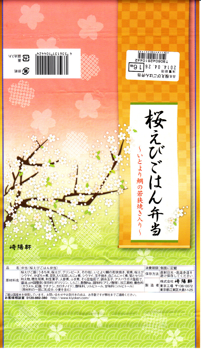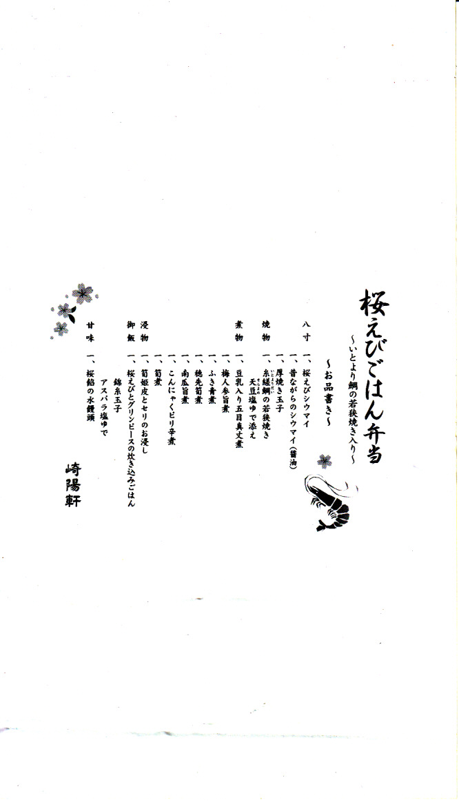 春季限定の駅弁として、2014(平成26)年3月1日から5月6日まで、東京地区と一部の横浜地区で販売。中身はサクラエビとグリーンピースの炊込飯、タイ若狭焼、タケノコやカボチャやフキなどの煮物、タケノコ煮、タケノコとセリのおひたし、玉子焼、桜あん水まんじゅう、シウマイ1個と桜えびシウマイ1個など。