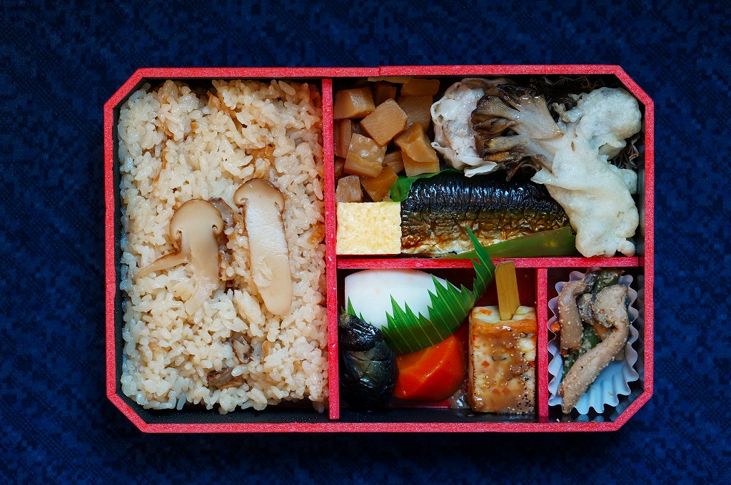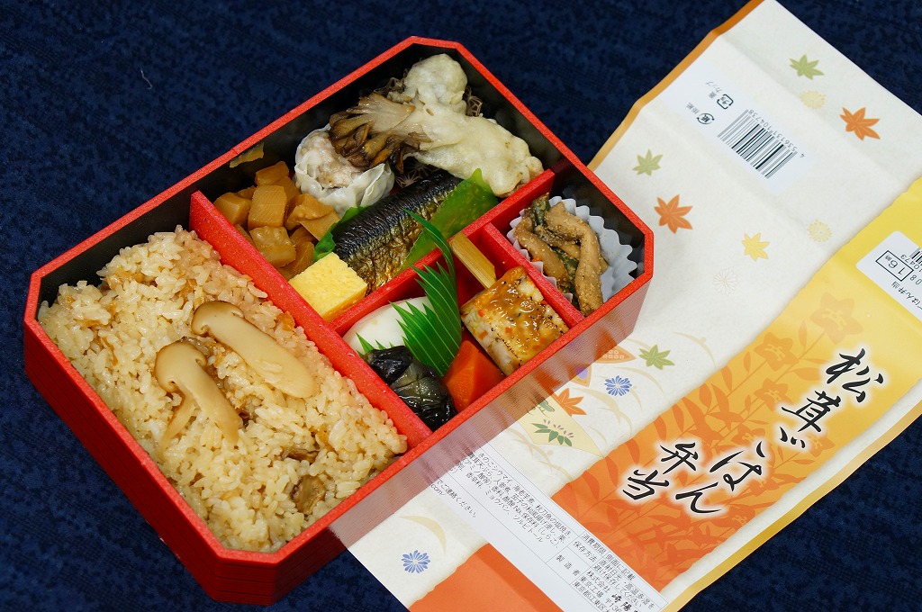 崎陽軒の東京地区の松茸弁当の2014(平成26)年版で、9月1日から11月30日までの販売。この姿になったのは2011(平成23)年からで、今回の中身は松茸御飯、サンマの麹焼き、マイタケ天、湯葉しんじょう、エビイモとニンジンとナスの煮物、玉子焼、タケノコ煮、きのこシウマイなど。マツタケの香りや分量が多くなくても、素材や調味料の様々な香りが漂う高級弁当。