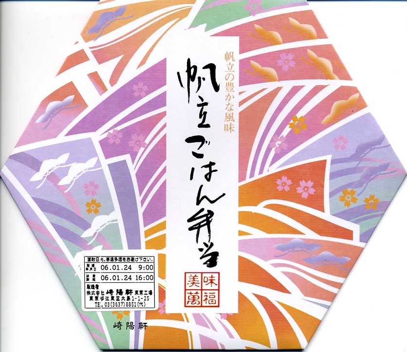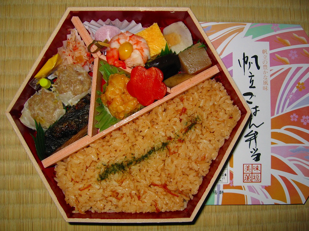 崎陽軒でも東京都内の百貨店の食品売り場にある店舗でのみの扱いだと思われる帆立弁当。正六角形の容器にボール紙のフタをかけてゴムでしばる。中身は半分が乾燥帆立貝柱の混ぜ御飯、半分がおかずでシウマイ、海老湯葉包み揚、鮭塩焼、玉子焼、煮物、ミニミニ大福など。