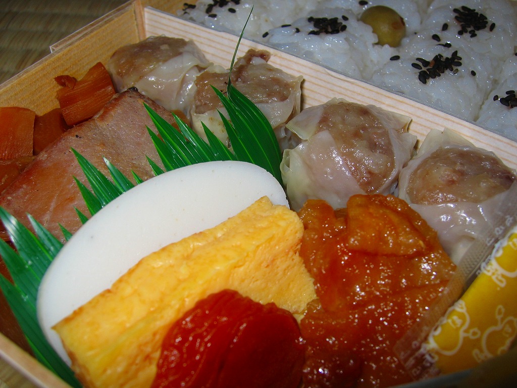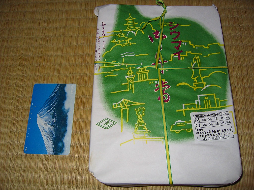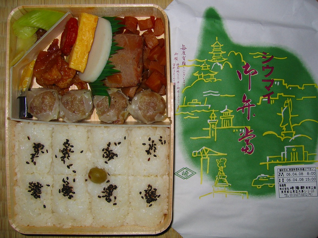2003(平成15)年2月2日に購入した、東京版シウマイ弁当。内容も値段は横浜版と同じでも、当時は以後と違い、ふたがボール紙のみで経木を挟まなかったため、中身の余分な水分を吸わない分、食感が落ちる感じがした。