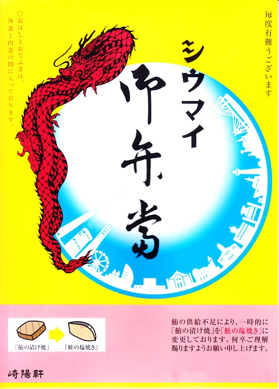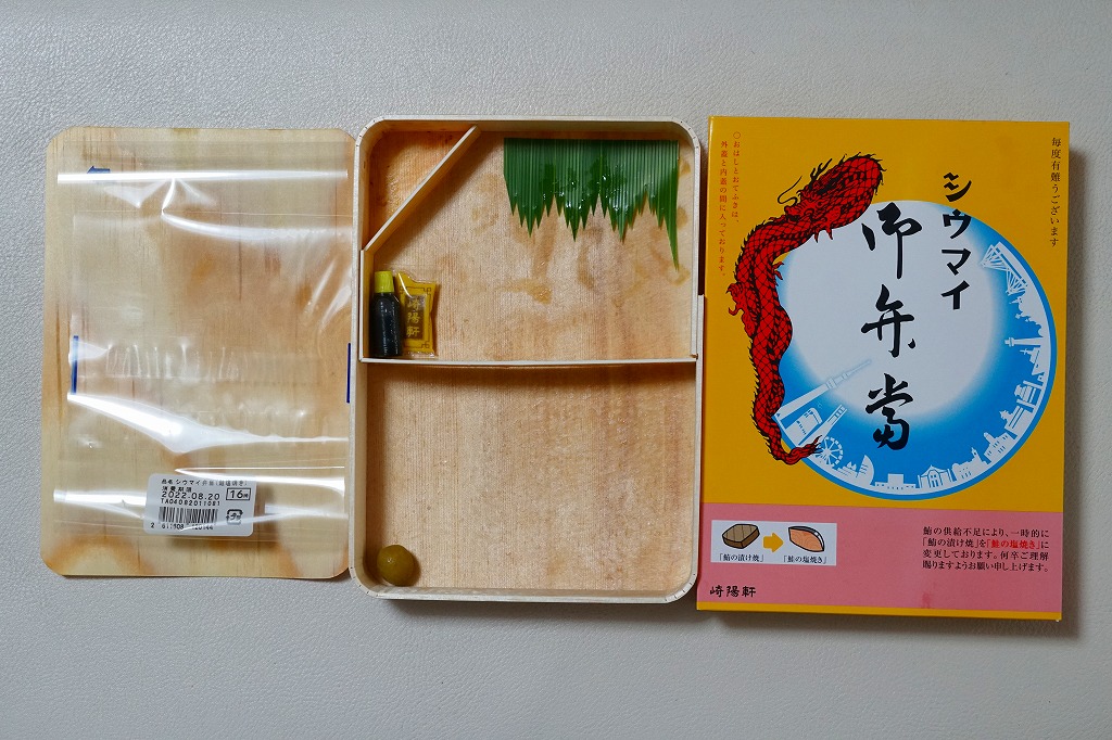 2022(令和4)年8月17日から23日まで販売。普段の駅弁「シウマイ弁当」について、材料の供給不足のためこの1週間だけ、中身から鮪の漬け焼をなくし、鮭の塩焼きを加えた。その事実がイラスト付きでふたに記され、シールを貼るなどでなく刷り直して使われた。たしかによく見ると、中身のマグロがサケに替わっている。小粒の鮭塩焼はまるでタイか銀ムツのような脂と弾力を持ち、駅弁のサケでは出色の出来映えだと感じたが、ネット上の感想ではあの固くて醤油辛いマグロのほうがよいという意見が多かったように見えた。たしかに飯のおかずや酒のつまみには、サケよりマグロが向いていると思う。