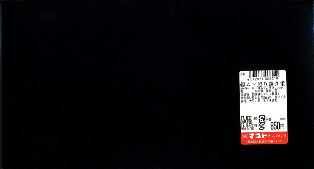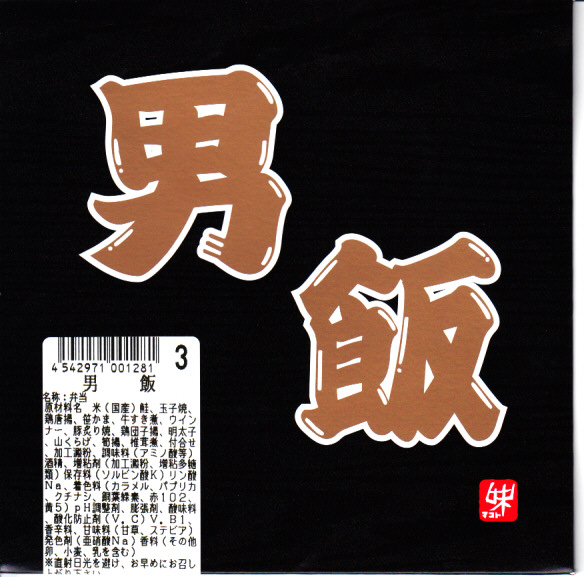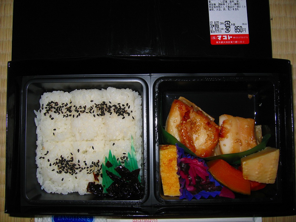 本当に真っ黒なふた付き長方形ボール紙容器を、輪ゴム1本で留めて、食品表示ラベルを貼る。中身は胡麻振り御飯にたっぷりの銀ムツ照り焼き、カボチャとニンジンと玉子焼というシンプルな構成。駅弁の名前はともかく食品表示に銀ムツという名を記していいのかと思うが、味は普通に美味い。駅では売れていると思うが、駅弁として無名が過ぎて収穫報告が見あたらない。2006年頃までの販売か。
