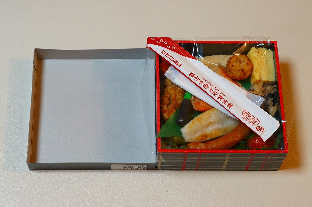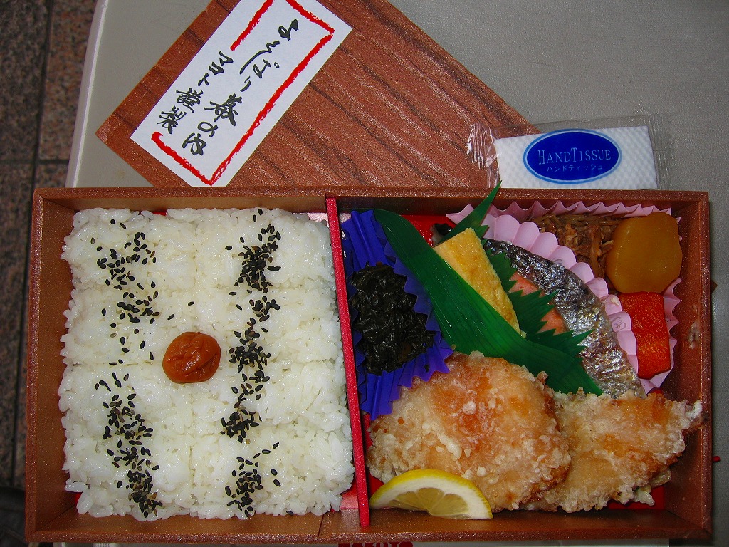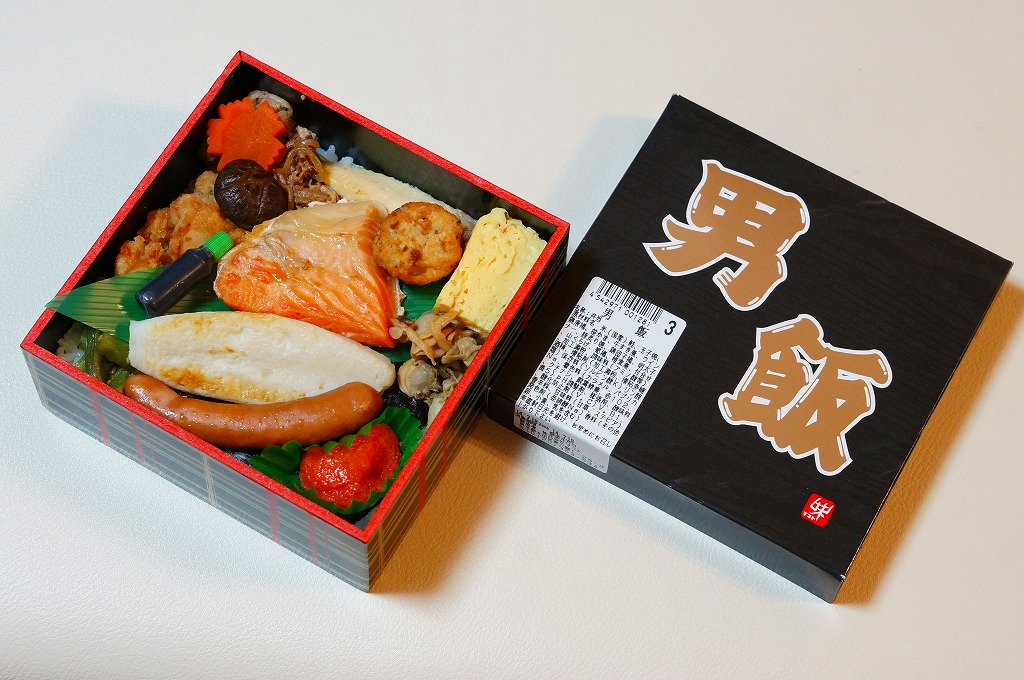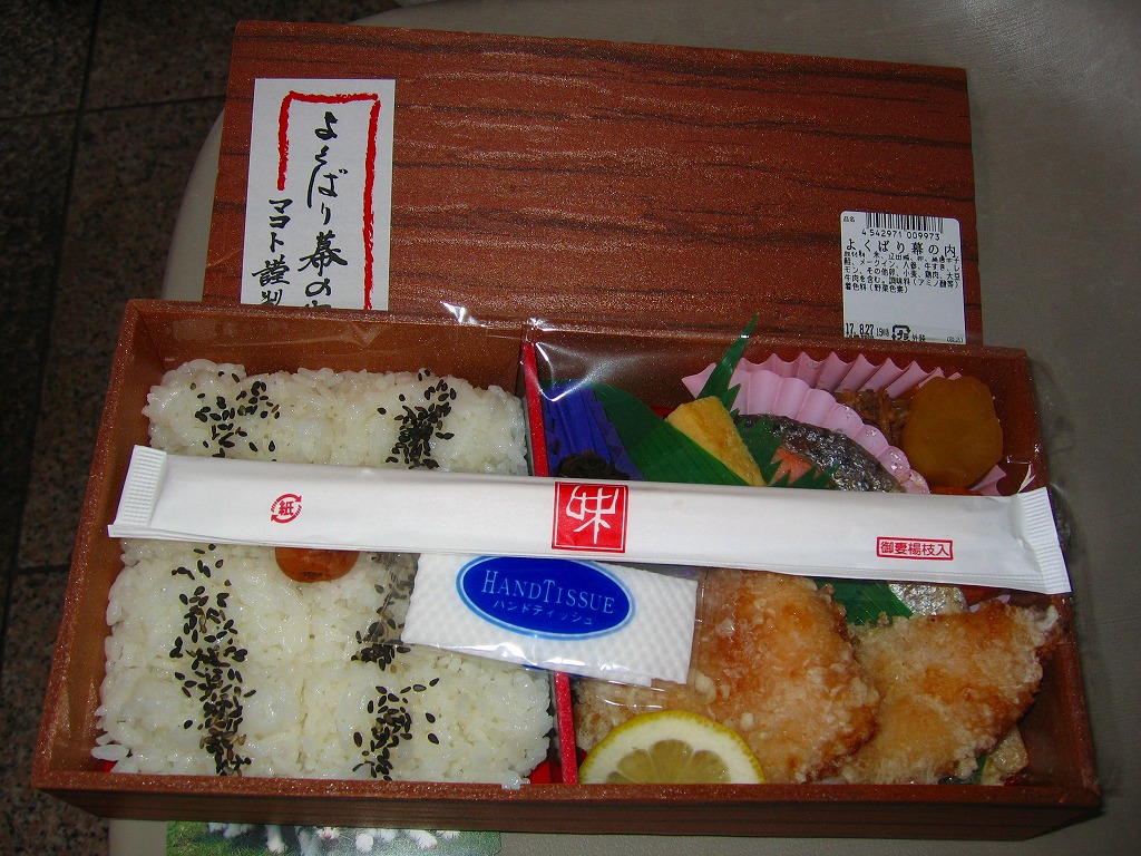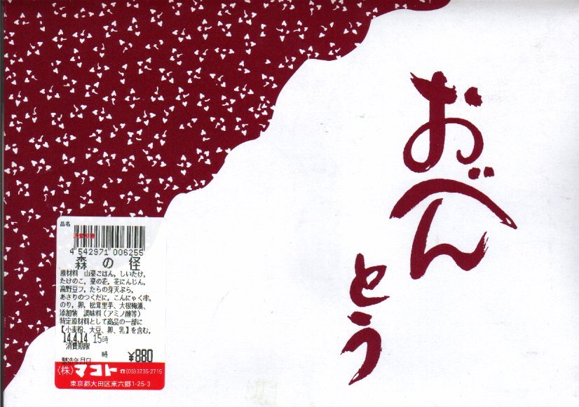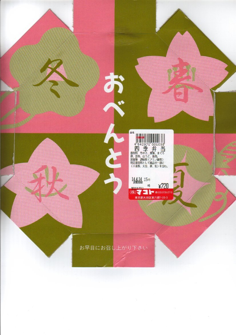 八角形の発泡材製容器を、春夏秋冬の漢字を記したボール紙のふたで覆う。中身は味が分からないほど薄味の味付け御飯が半分、コンニャクやごぼうや人参などの煮物が4分の1、マグロ焼き魚やカニカマ揚げなどで4分の1。おそらくこれが春バージョンで、年4回中身が変わるのだろう。市中の弁当店でも同種の商品を取り扱う。この商品は現存しない模様。