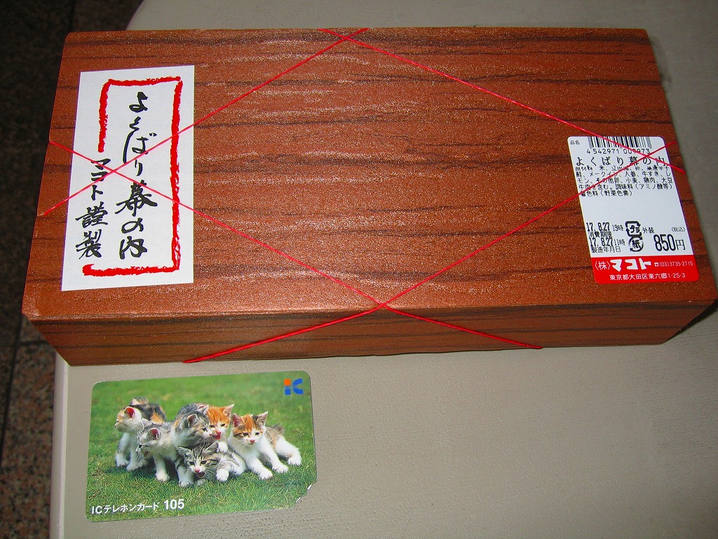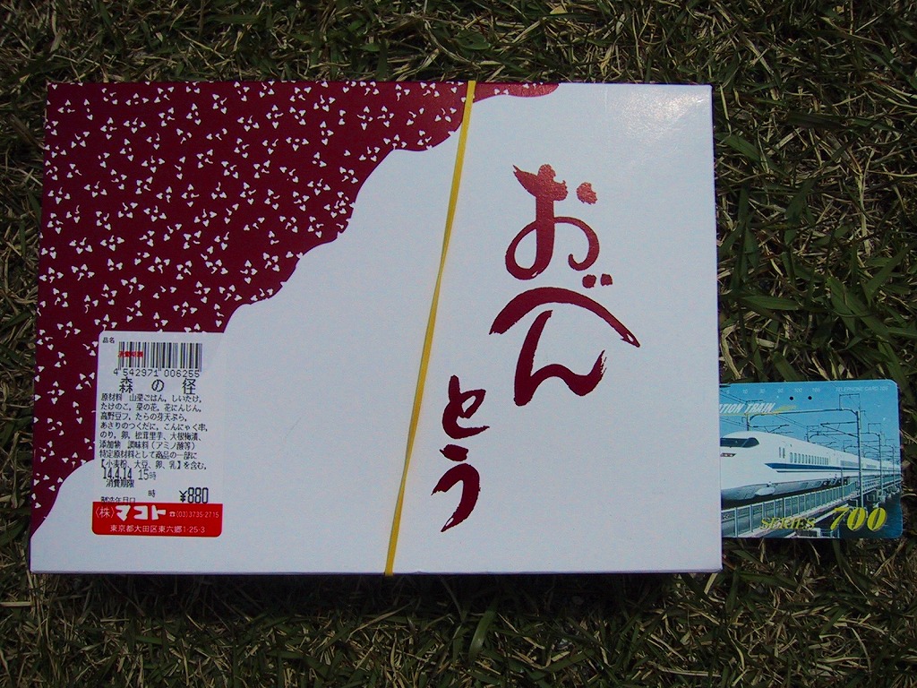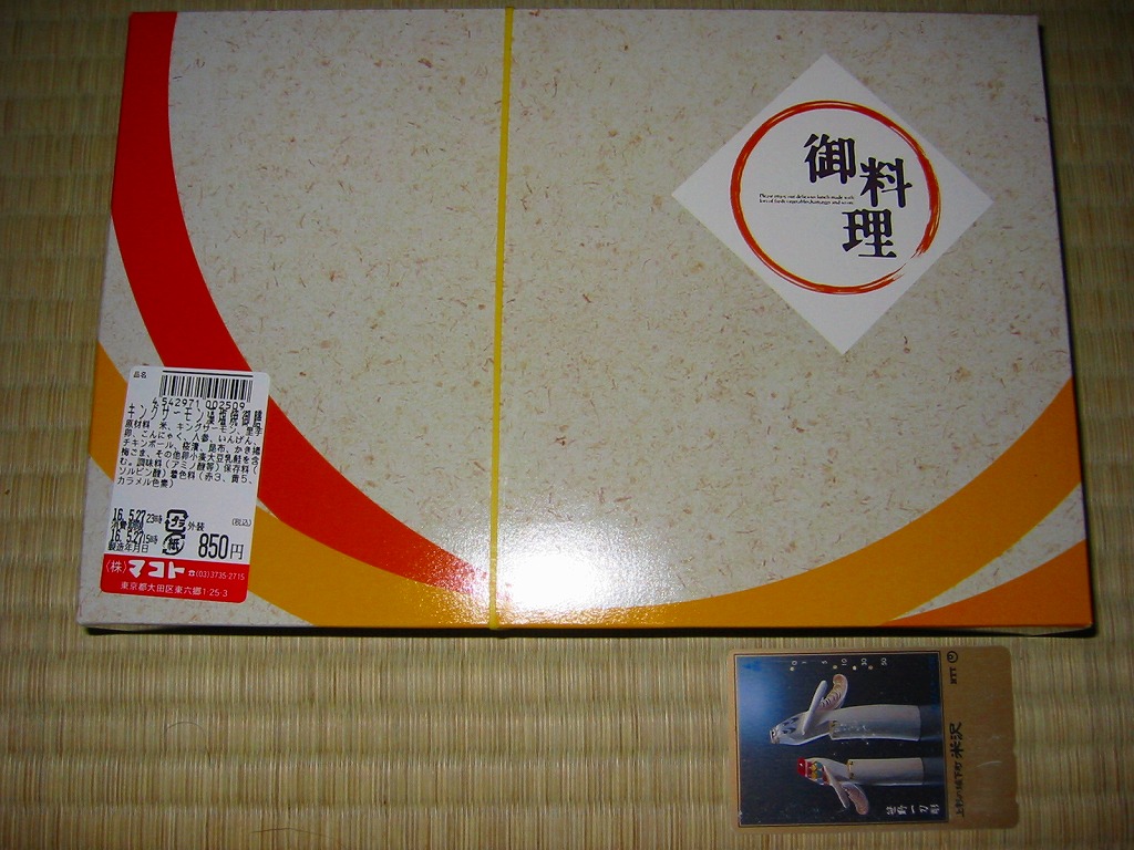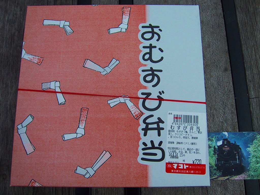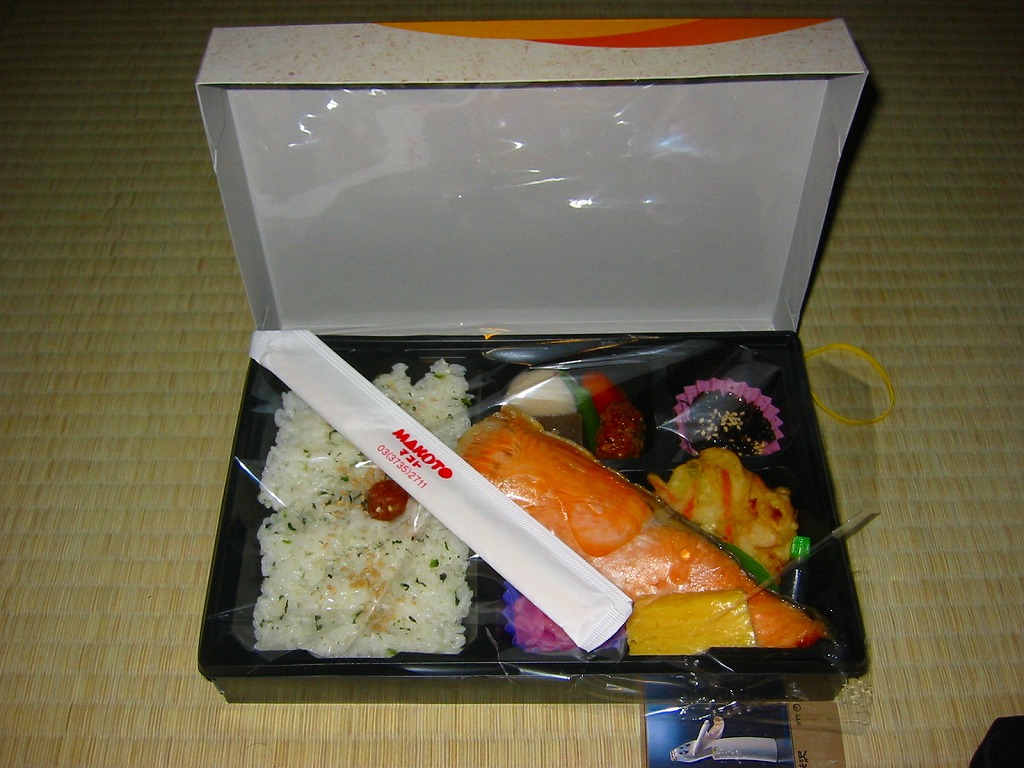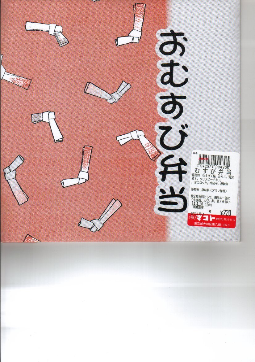 八角形の発泡材製容器を、春夏秋冬の漢字を記したボール紙のふたで覆う。中身は味が分からないほど薄味の味付け御飯が半分、コンニャクやごぼうや人参などの煮物が4分の1、マグロ焼き魚やカニカマ揚げなどで4分の1。おそらくこれが春バージョンで、年4回中身が変わるのだろう。市中の弁当店でも同種の商品を取り扱う。この商品は現存しない模様。
