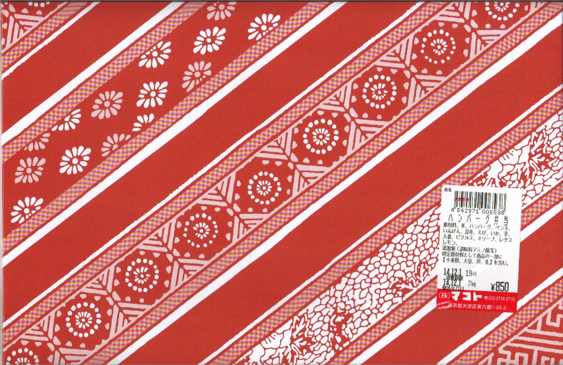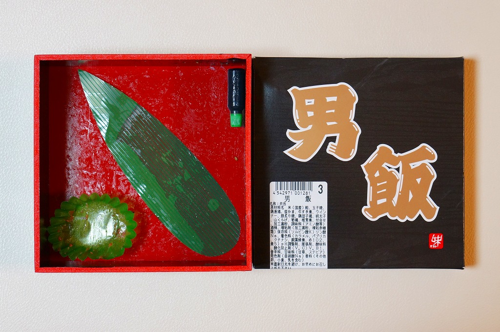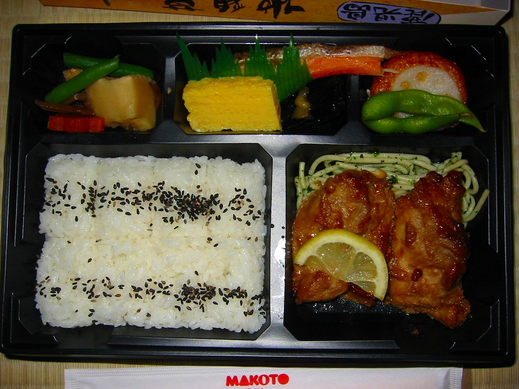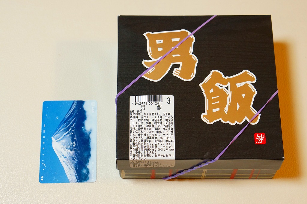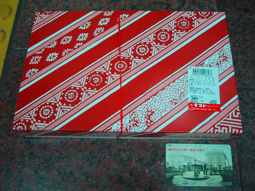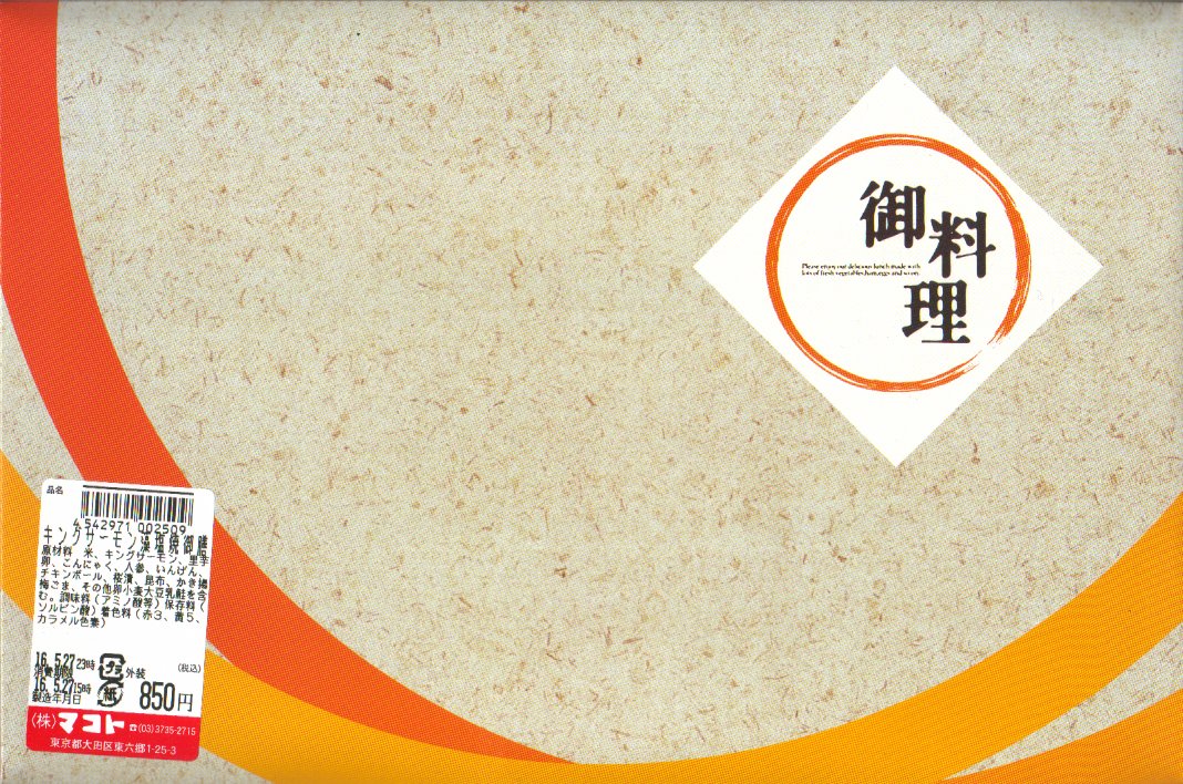 八角形の発泡材製容器を、春夏秋冬の漢字を記したボール紙のふたで覆う。中身は味が分からないほど薄味の味付け御飯が半分、コンニャクやごぼうや人参などの煮物が4分の1、マグロ焼き魚やカニカマ揚げなどで4分の1。おそらくこれが春バージョンで、年4回中身が変わるのだろう。市中の弁当店でも同種の商品を取り扱う。この商品は現存しない模様。