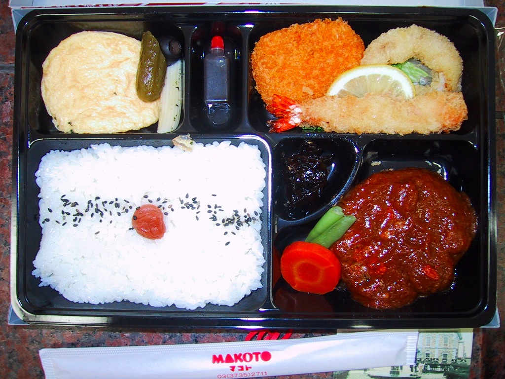 惣菜弁当風のビニール容器を薄いボール紙の箱に詰める。中身は日の丸御飯にデミグラスソースがかかったハンバーグ、海老フライにイカリングフライにクリームコロッケといった、ほかほか弁当タイプのハンバーグ弁当。駅弁の風情は微塵も感じられないが、東京駅で千円以下なのに味が良い。実用本位のお弁当。