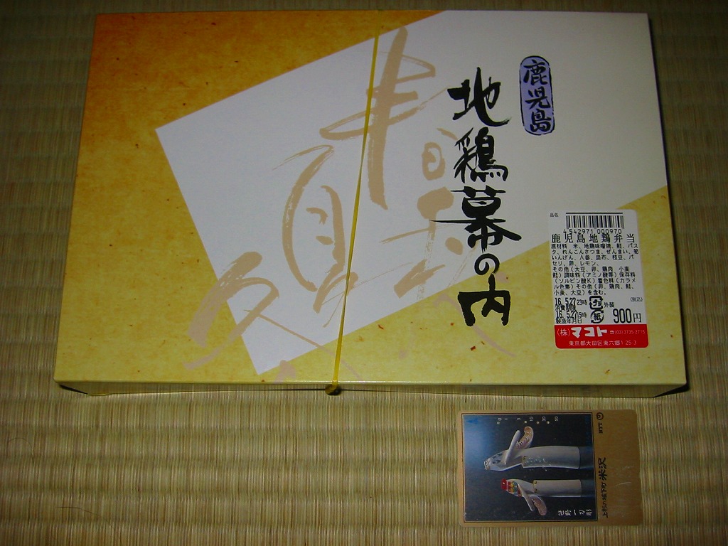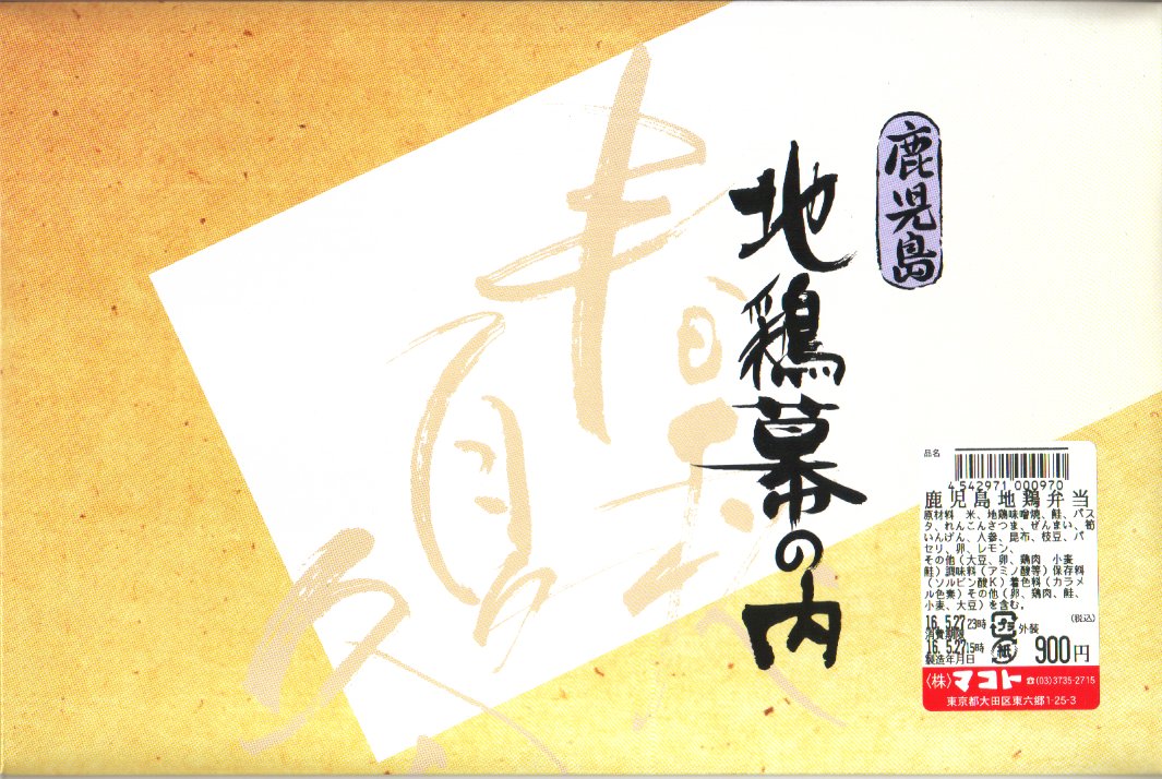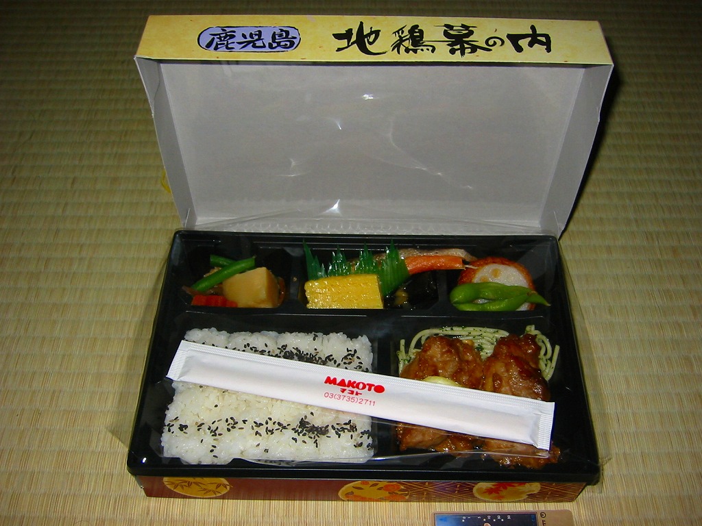 2002(平成14)年までには販売されていたと思われる。駅弁の名前とやや異なる名称を印字した専用の長方形ボール紙容器に黒いトレーを入れる。中身は胡麻振り俵飯にしそ味パスタを敷いた地鶏味噌焼と、焼鮭や煮物や昆布巻などの付け合わせ。東京駅弁でなぜ鹿児島地鶏と思えなくもないが、鶏は唐揚のような照焼のような、甘味も辛味も硬さも柔らかさも程良い感じ。取扱売店の人気駅弁なのか、いつも一番目立つ位置に鎮座しているように見えた。2007年頃までの販売か。