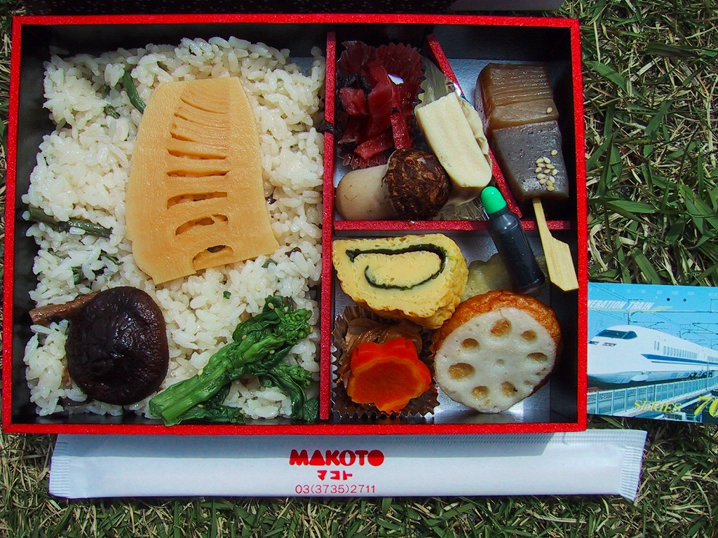 長方形の容器にボール紙のふたをかける。中身は大切りのタケノコと丸ごとの椎茸を載せた山菜御飯に、菜の花・高野豆腐・出汁巻卵・こんにゃく串・里芋などが入る、肉も魚もない健康志向のお弁当。現存しない模様。