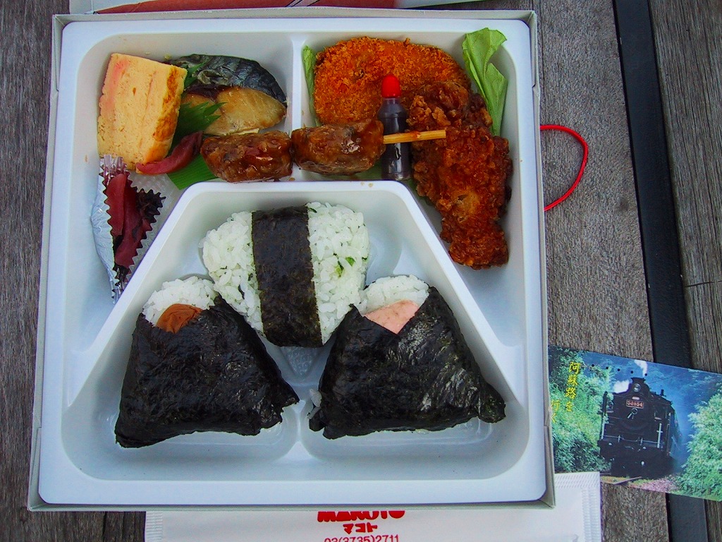 薄手の正方形ボール紙製容器に白いトレーを入れる。おむすびが、具が飯の上に乗り海苔を衣に顔をのぞかせている梅とタラコ、そして野沢菜の混ぜ御飯のおにぎりで合計3個。おかずは鳥足唐揚にコロッケや焼き魚や肉団子に玉子焼。運動会やピクニックの行楽弁当をプロが作ればこのようになります、といった感じで、列車内ではなく屋外の広場や公園で食べたくなる。この姿と内容では現存しない模様。
