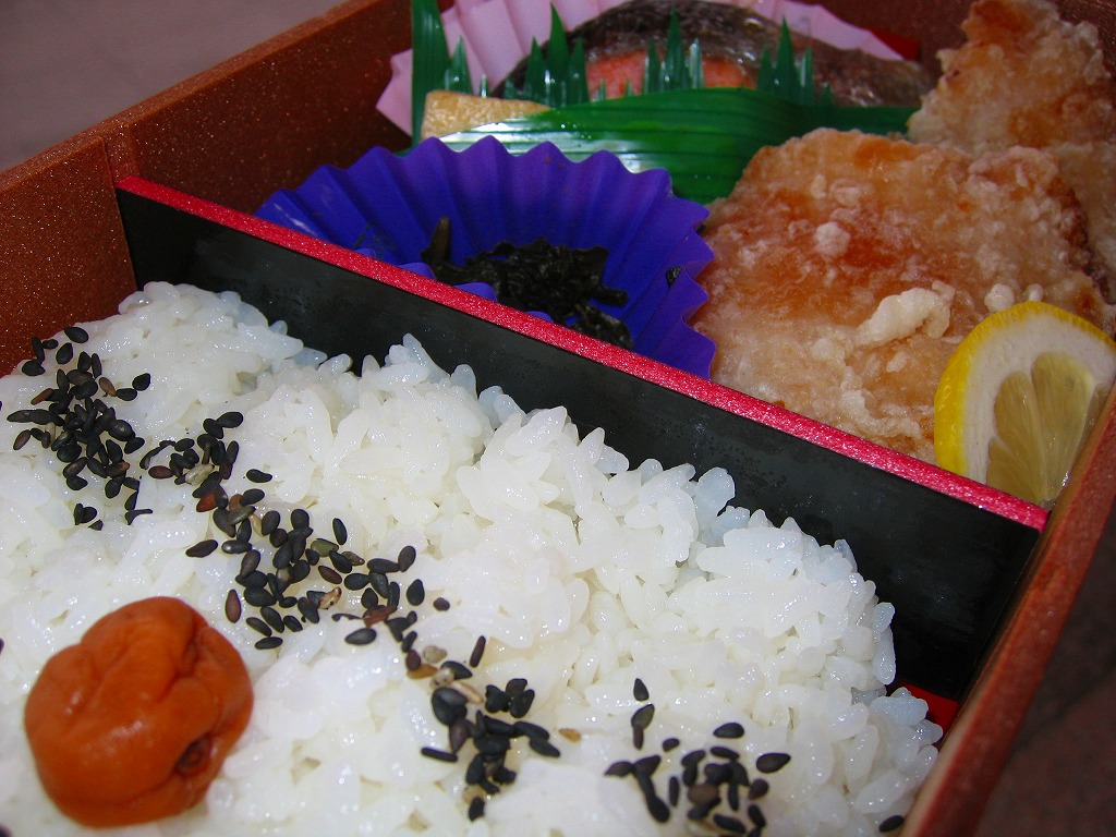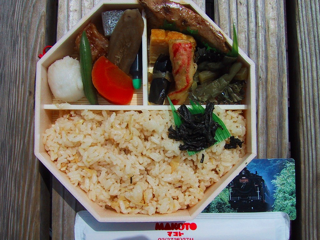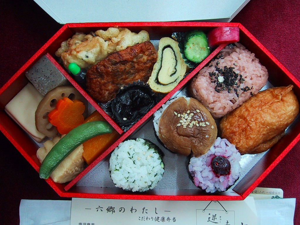 亀甲形の容器にボール紙のふたをかけて輪ゴムでしばる。ふたを開けるとお品書きが登場。中身は赤飯と野沢菜になんと北海道産ハスカップのおむすびにいなりと椎茸ずしと賑やかに5種類もの御飯で半分、鶏肉ごま揚げやタコ入り薩摩揚げなどでさらに半分、残りに人参やタケノコなどの煮物に高野豆腐が入る、「安全・自然・美味」をテーマにした健康志向のお弁当。価格は2003年の購入時で1,000円、2017年時点で1,130円。