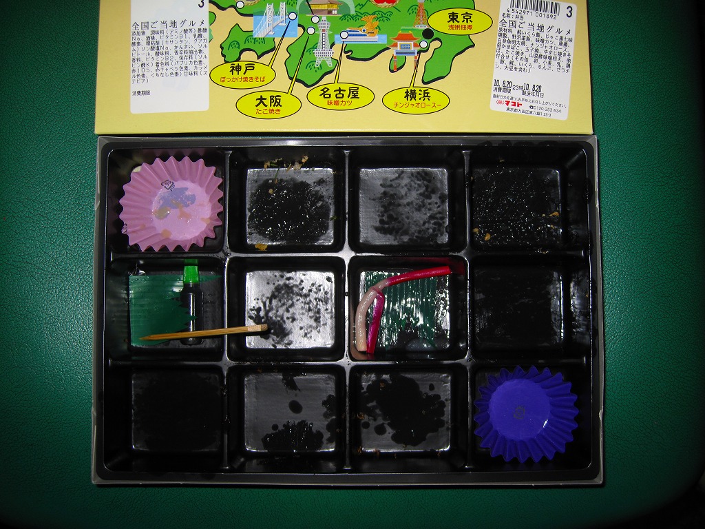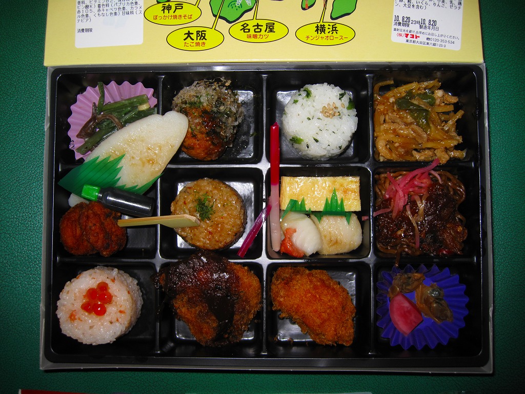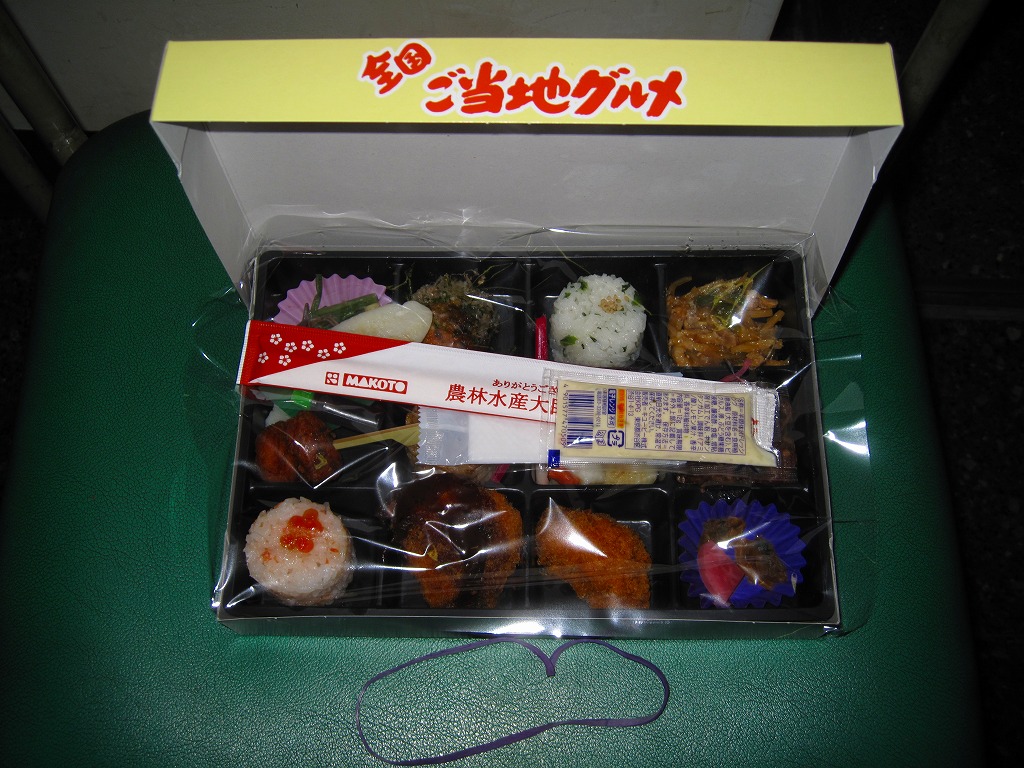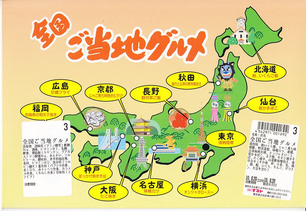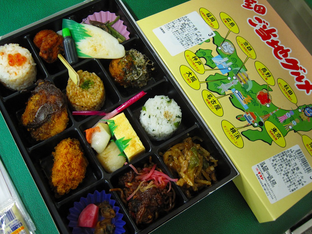 2010(平成22)年に発売か。長方形で拙いイラストのボール紙容器を使用、中身は12区画のトレーにその容器に書かれるとおり、北海道の「鮭、いくらご飯」、仙台の「笹かまぼこ」、秋田の「姫竹と山菜の酢味噌合え」、東京の「浅蜊佃煮」、横浜の「チンジャオロースー」、長野の「野沢菜ご飯」、名古屋の「味噌カツ」、京都の「じゃこ黒七味焼きむすび」、大阪の「たこ焼き」、神戸の「ぼっかけ焼きそば」、広島の「牡蠣フライ」、福岡の「白身魚の明太子焼き」と山菜が入っている。味や量は価格相応だと思う。どうしてこの価格でこういう商品を作ってみたくなったのか、聞いてみたいところ。2015年頃までの販売か。
