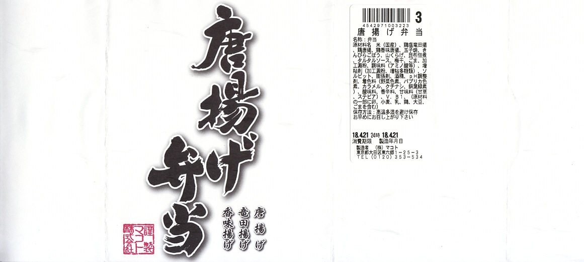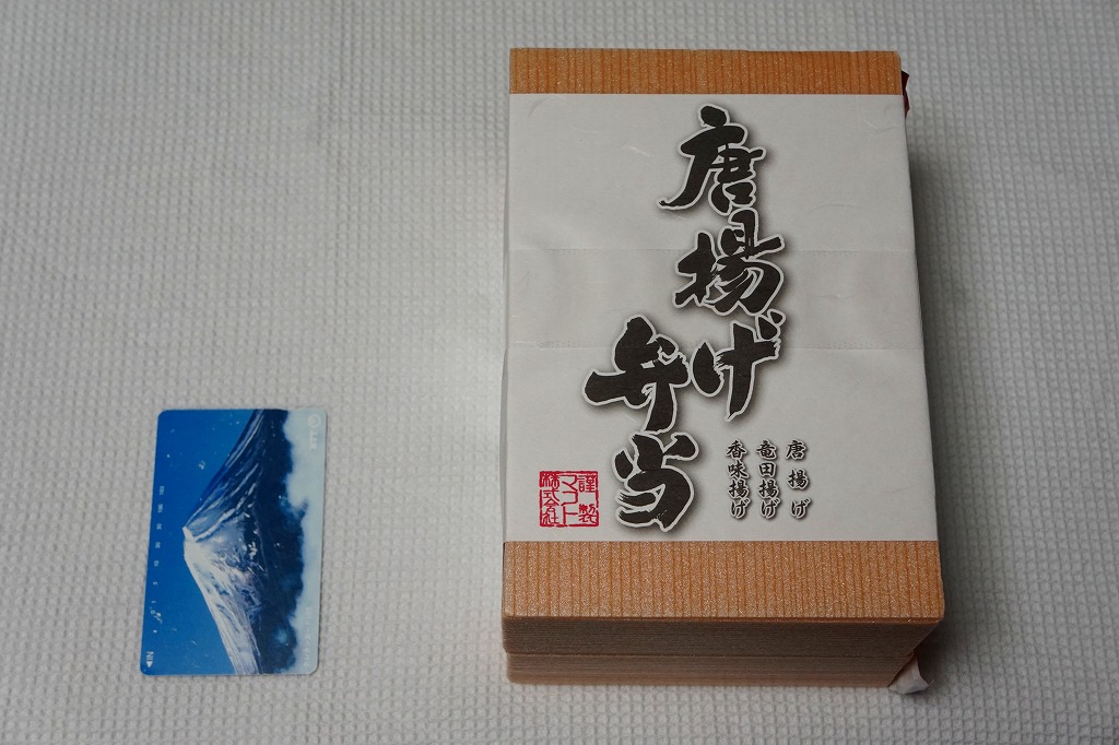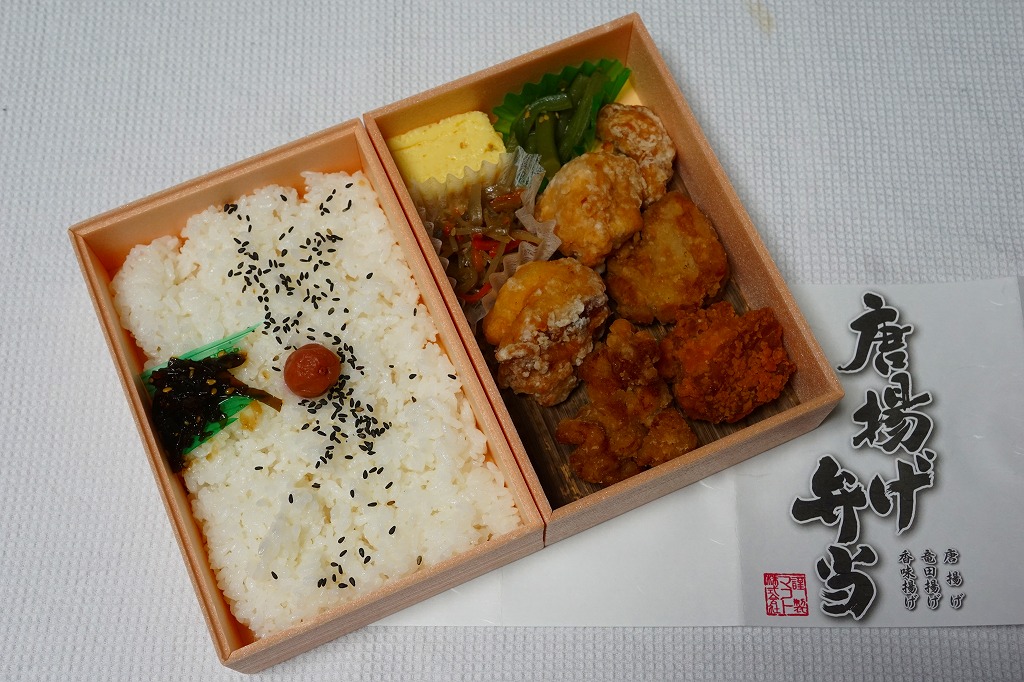 2018(平成30)年の発売か。平たく浅く古風なサイズの発泡材製折箱を2段に重ね、商品名を書いた掛紙で巻く。中身は下段が日の丸御飯、上段が鶏塩竜田揚、鶏唐揚、鶏香味唐揚で3種6個の鶏唐揚と、玉子焼、きんぴら、山くらげ。下記のとおり東京駅では過去に、各社が鶏唐揚3種の駅弁を出している。それらとだいたい同じ味と雰囲気を感じた。同年中に終売か。