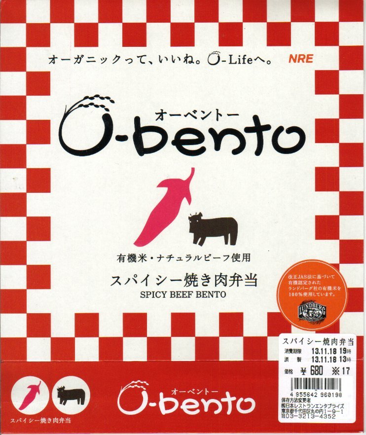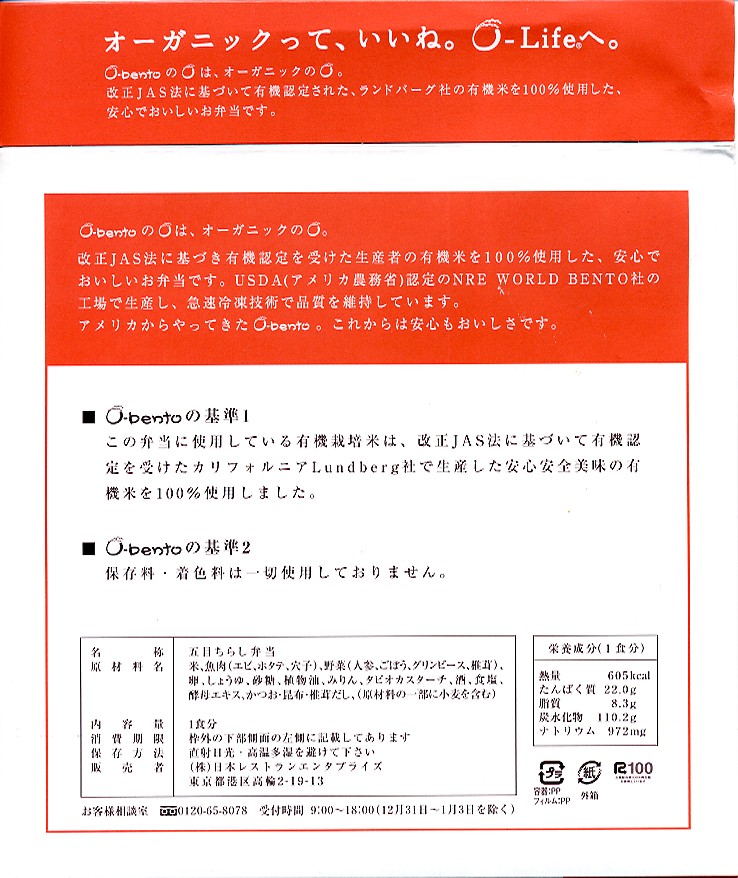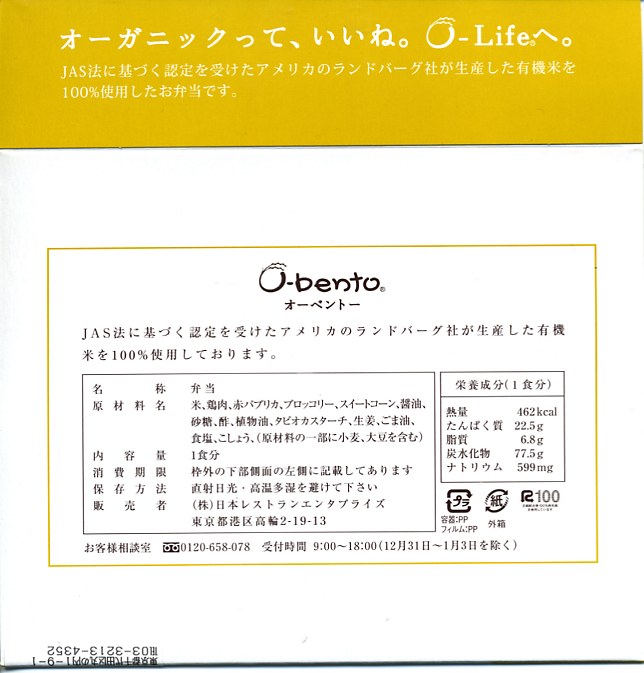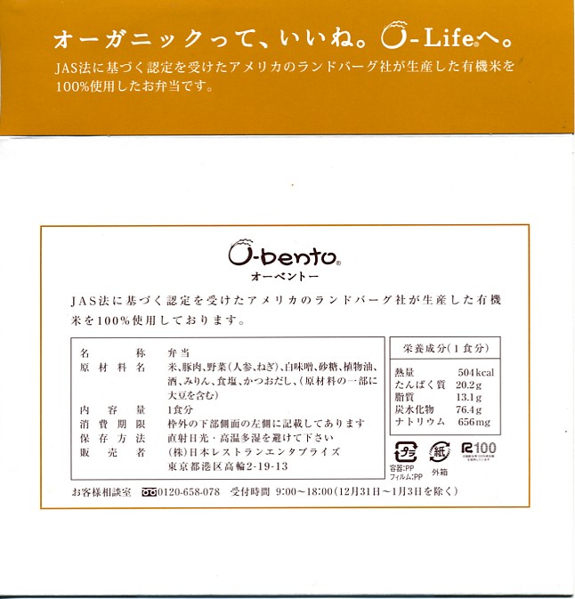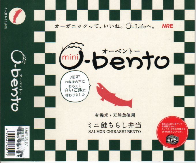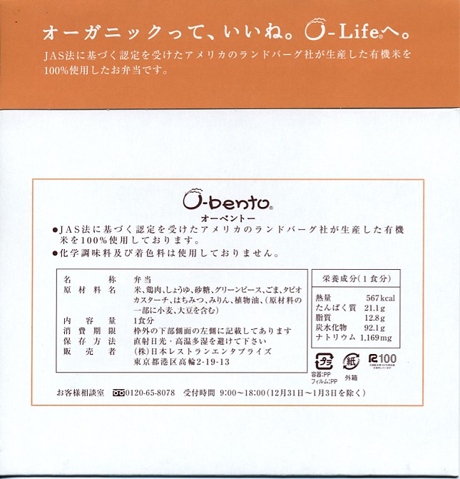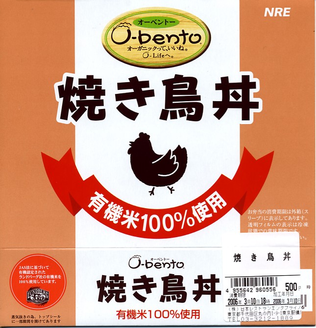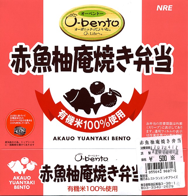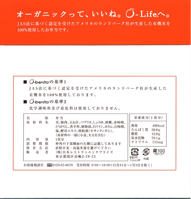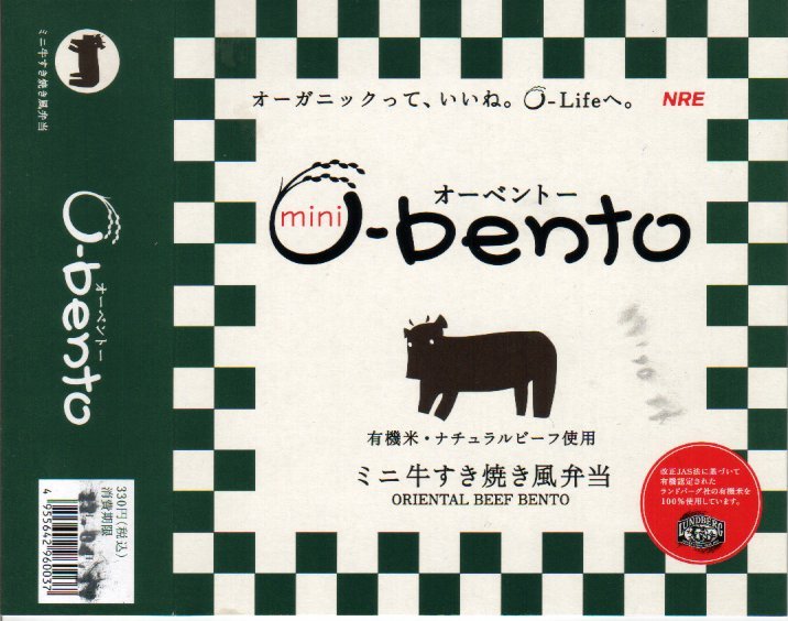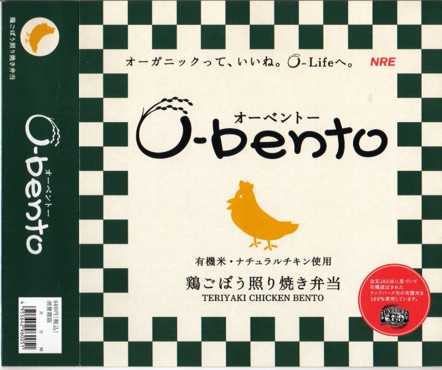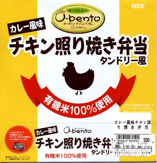 2005(平成17)年7月1日に再出発した、O−bentoシリーズの新作。アメリカ産有機米を使った、まるごと電子レンジで加熱の冷凍輸入弁当というコンセプトは変えずに、旧タイプに比べて容器がコンパクトな長方形に変わり、大680円・小390円の商品構成が500円均一となった。
