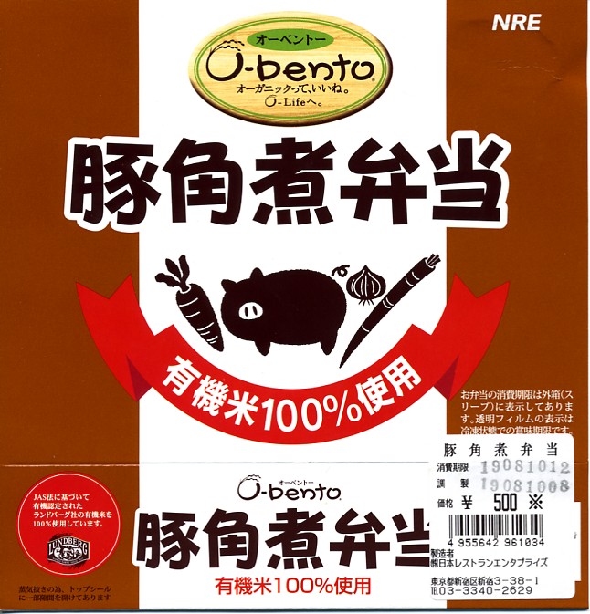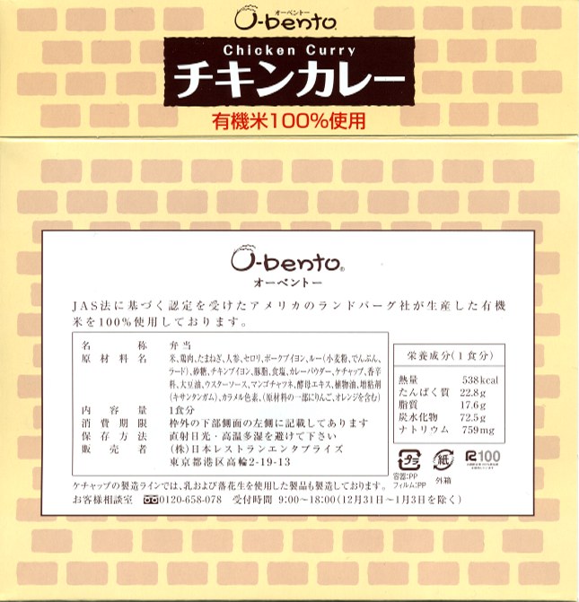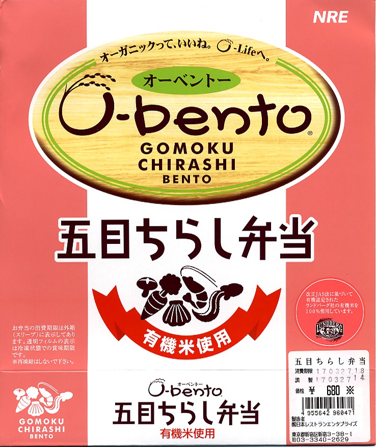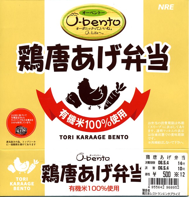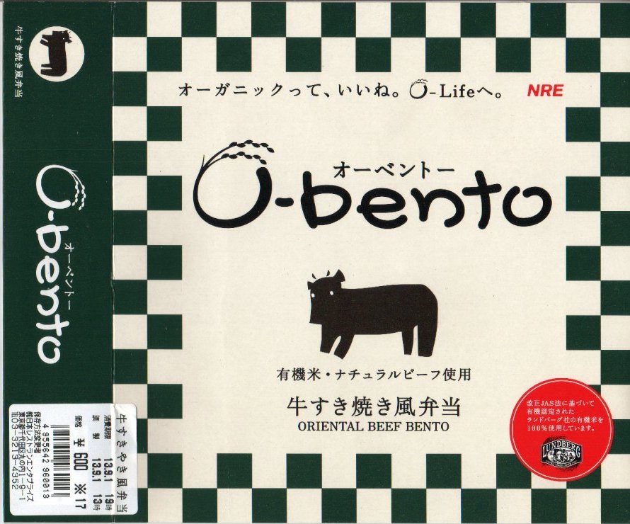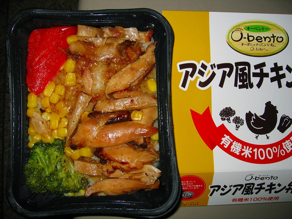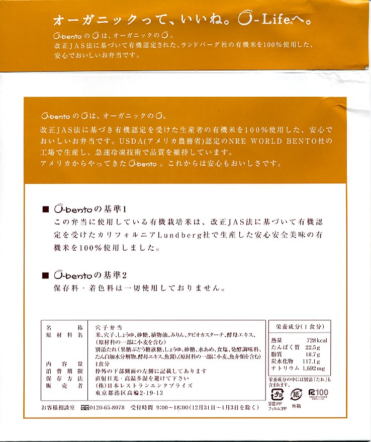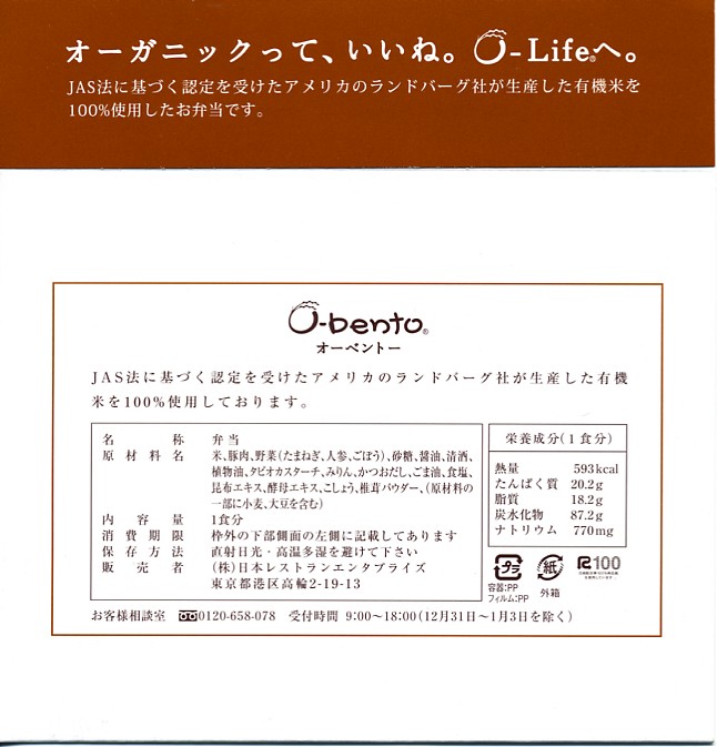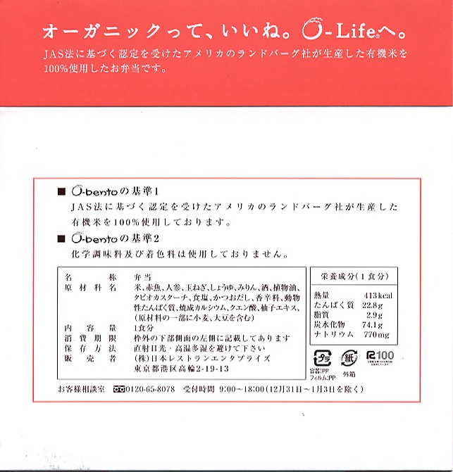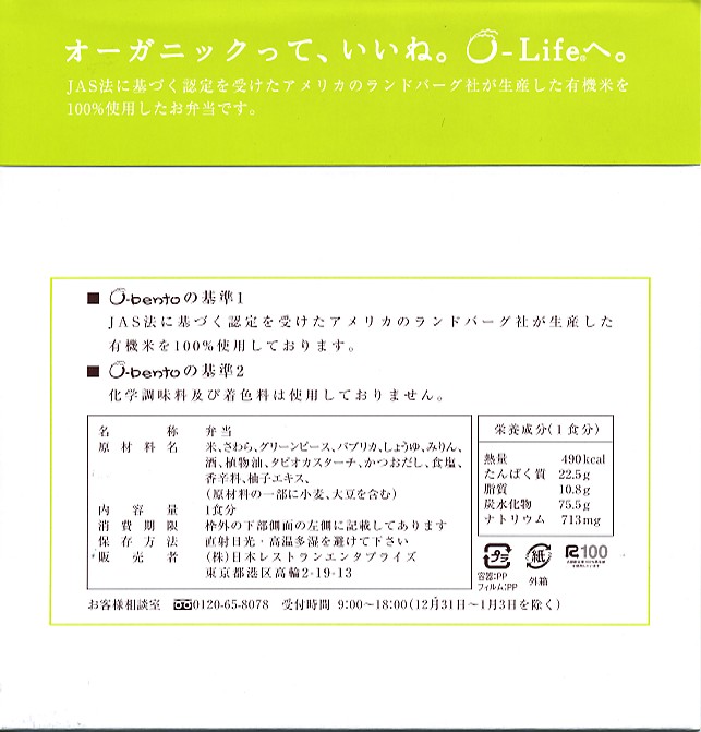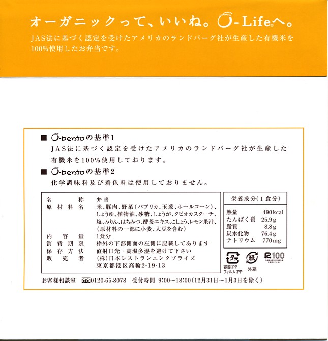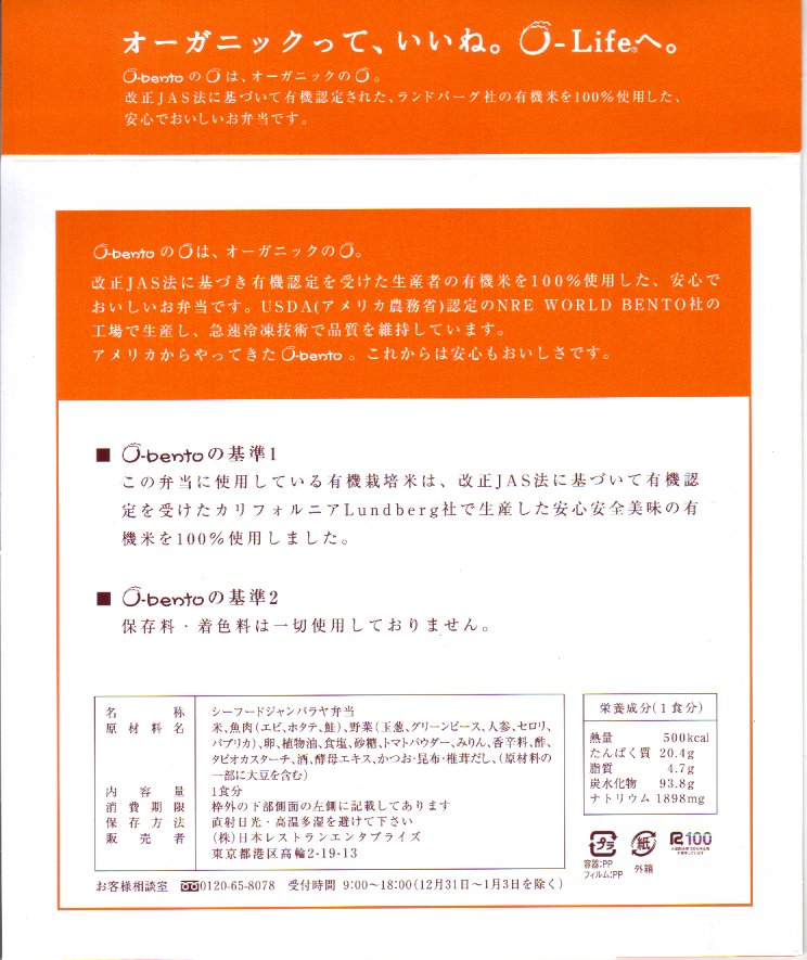 2005(平成17)年7月1日に再出発した、O−bentoシリーズの新作。アメリカ産有機米を使った、まるごと電子レンジで加熱の冷凍輸入弁当というコンセプトは変えずに、旧タイプに比べて容器がコンパクトな長方形に変わり、大680円・小390円の商品構成が500円均一となった。