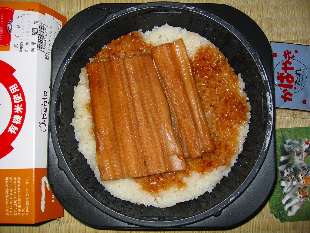 2005(平成17)年2月に発売された、O−bentoシリーズの新作。白御飯の上に、一見して不味そうなアナゴの蒲焼きを1切れ載せる。白御飯の使用で冷凍弁当のマイナス面が露骨に出て、具体的には円柱形平板の円周部が餅か煎餅のように固く硬い感じがした。穴子とタレの風味はよくできているので、もったいないと思う。O−bentoだからといって単純に批判するのは良くないと思いながら、今回同時購入の二品には落第点を。2005年7月のリニューアルで終売。