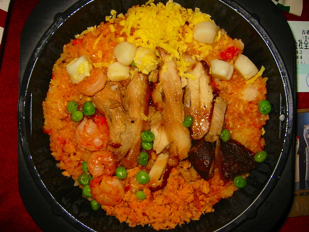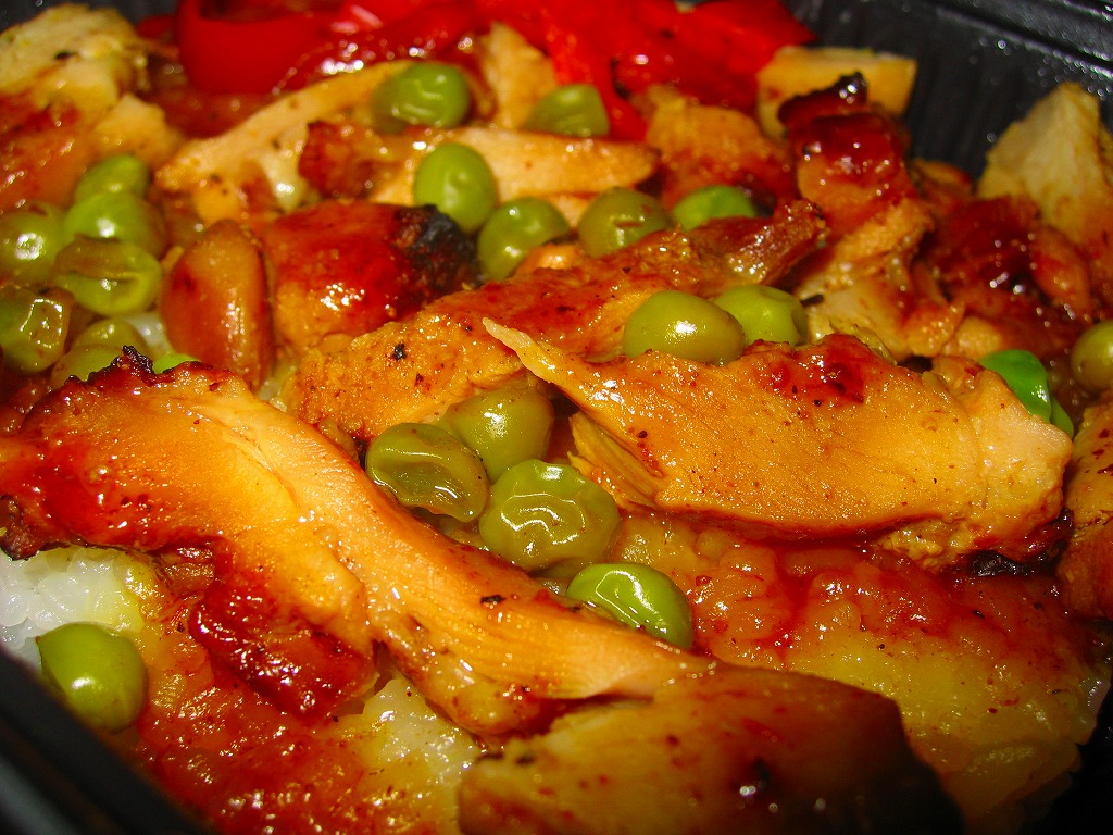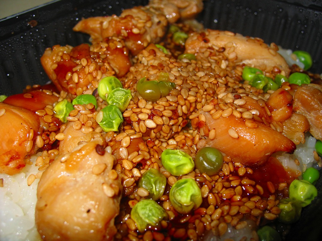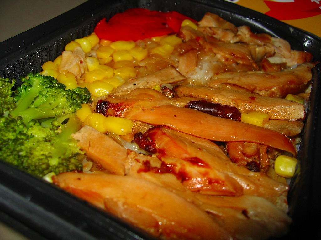 2001(平成13)年7月に登場した輸入弁当。薄手のボール紙製パッケージに、フィルムで密封されたコンビニ弁当風のプラスティック製容器が入る。中身は白御飯をサクッとした食感のアメリカンな鶏肉と、牛蒡・人参・椎茸・絹さや・赤パプリカ・錦糸玉子・いりゴマで覆うもの。発売当初は330円であったが、2002年には390円に値上げ。2005年7月のリニューアルで消滅。