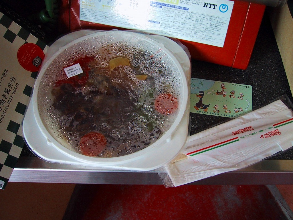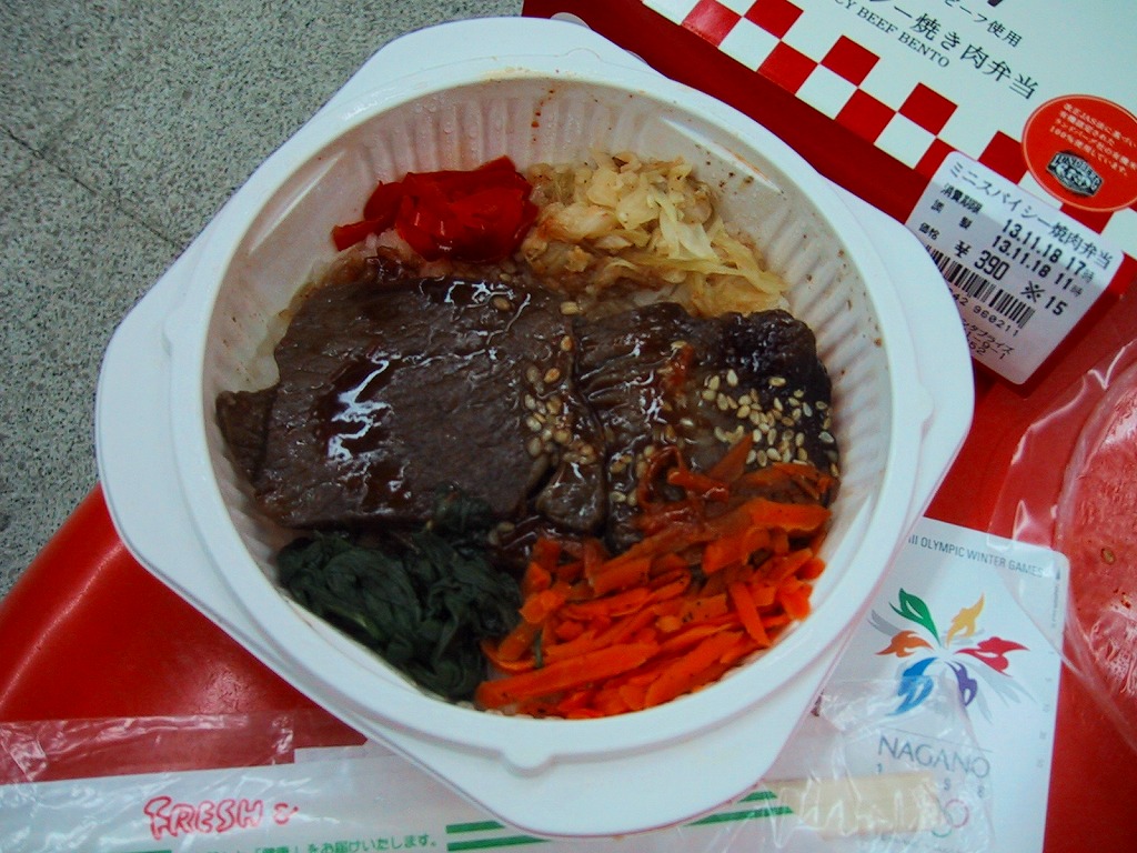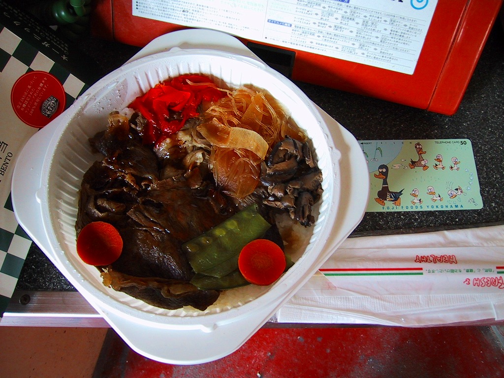 薄手のボール紙製パッケージに、フィルムで密封されたコンビニ弁当風のプラスティック製容器が入る。中身は白御飯をビーフジャーキーのような硬い牛肉と、玉葱・人参・椎茸・春雨・絹さやと赤パプリカで覆うもの。発売当初は600円であったが、2002年から680円に値上げ。この「牛すき焼き風弁当」は、2003(平成15)年12月からの米国産牛輸入停止と前後して終売の模様。