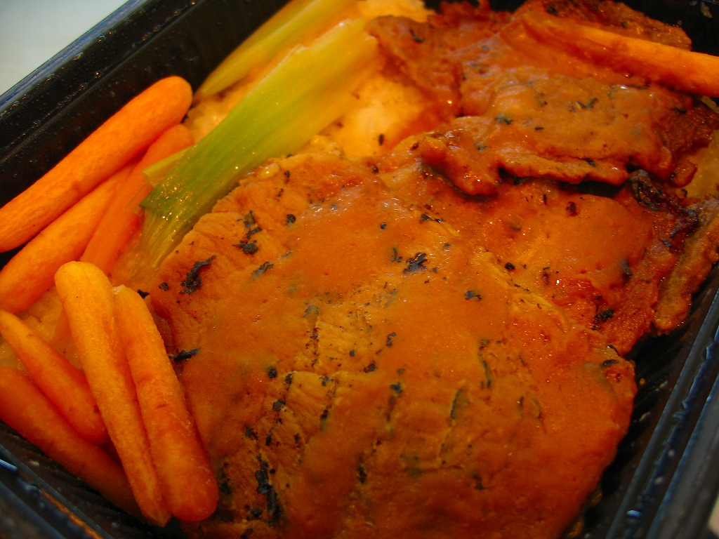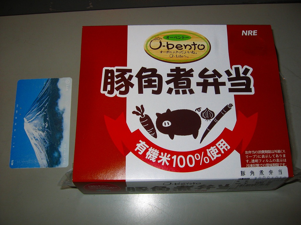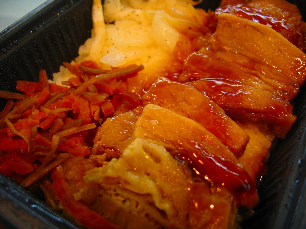 2006(平成18)年9月21日に発売された、O−bentoシリーズの新作。白御飯の上に、見た目は崩れてしまった豚角煮が半分、タマネギ炒めが1/4、ごぼうと人参の炒め物が1/4。豚肉のこういう商品なので、臭いか固いかと思ったらそうではなく、意外にいける味。少なくともこの時のO−bentoの現行品は、見栄えと食感を除けば不味いわけではなく、駅弁でない場所に生き残る道があるような気がした。しかし上記のとおり、2007年中にシリーズそのものがなくなった。