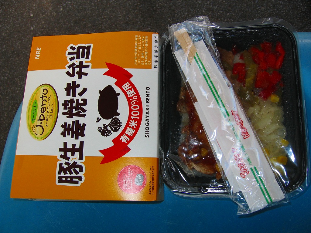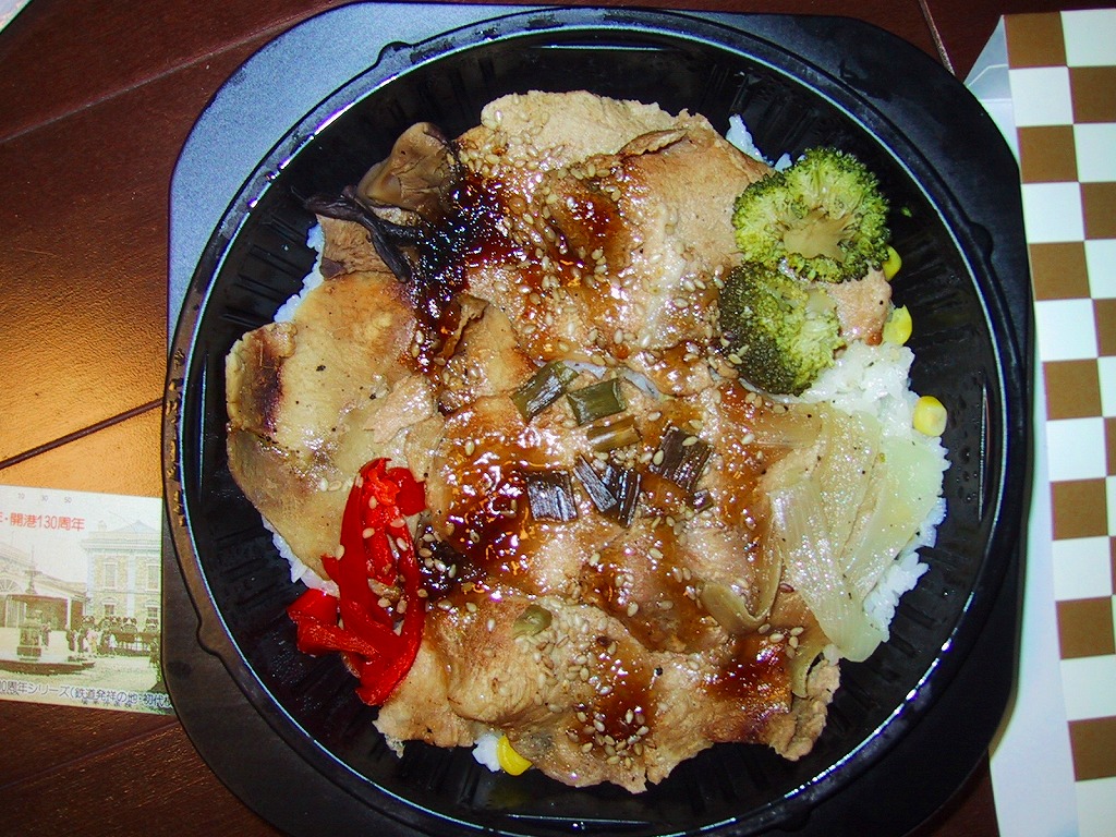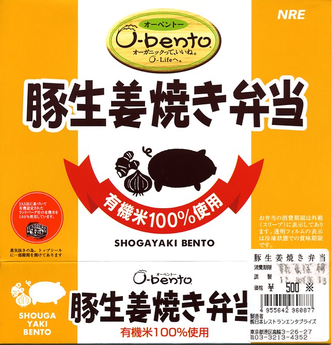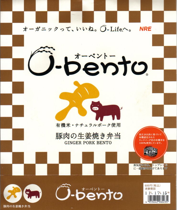 2001(平成13)年12月21日に発売された、O−bentoシリーズの新作。薄手のボール紙製パッケージに、フィルムで密封されたコンビニ弁当風のプラスティック製容器が入る。中身はアメリカ産あきたこまちの白御飯の上を豚生姜焼、というより豚ロースのソース和えをぺたぺたと載せて覆う。2005年7月のリニューアルで終売。