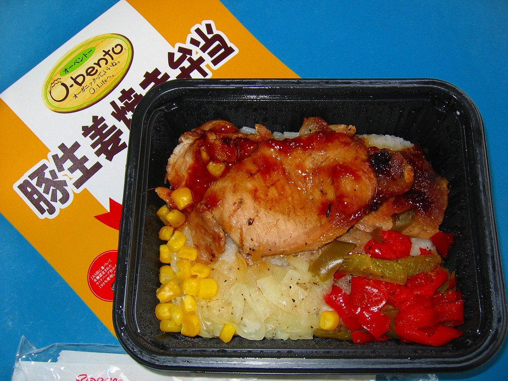2005(平成17)年7月1日に再出発した、O−bentoシリーズの新作。白御飯の上にタマネギ、パプリカ、コーン、ピーマン?と豚生姜焼を載せてコショウを振る。