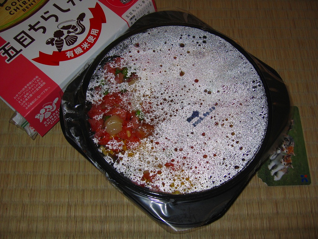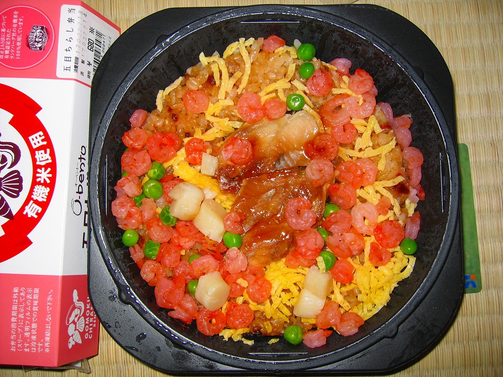 2004(平成16)年12月に発売された、O−bentoシリーズの新作。今度は「エビ・ホタテ・穴子の海の幸と、錦糸玉子・グリーンピース・椎茸の彩り豊かな具だくさんの五目ちらし」が売り文句で、確かにそれと中身は一致するのだが、エビやホタテがカップラーメンに入るあのタイプでは「五目ちらし」らしくない。御飯が酢飯ではなく茶飯であることも違和感を演出し、販売箇所には酢飯でない旨の注記もあった。悪い商品ではないけれど、名前のイメージと中身が大きく異なる感じ。2005年7月のリニューアルで終売。