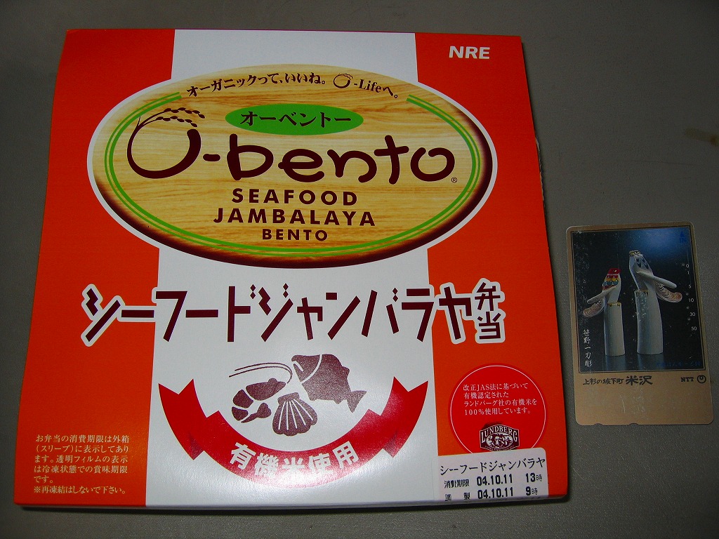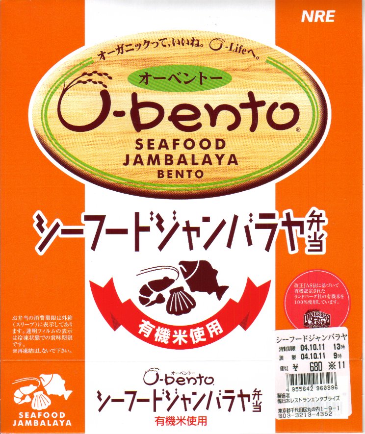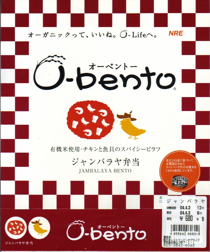 2003(平成15)年10月に発売された、O−bentoシリーズの新作。聞き慣れない料理名は、フランス料理とアメリカ南部料理が混在した「ケイジャン料理」の代表的なメニューだそうで、「チキンと魚貝のスパイシーピラフ」と副題が付いている。パッケージは他のO−bentoと同じ構造、中身はチリソース御飯の上に鶏肉や海老や椎茸や帆立貝柱がやはりスパイシーになって載るもの。刺激物は解凍弁当の味付けにピッタリだと思った。2005年7月のリニューアルで終売。