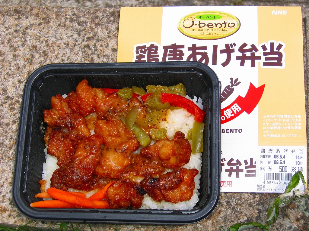 2006(平成18)年4月24日に発売された、O−bentoシリーズの新作。白御飯の上に鶏唐揚というか、焼き鳥のあんかけというか、衣も身もぷにょっとした肉団子が無数に散り、人参と2色のパプリカが載る。駅弁にもコンビニ弁当にもないタイプの不思議な風味なので、意外に固定ファンが付くかもしれない。