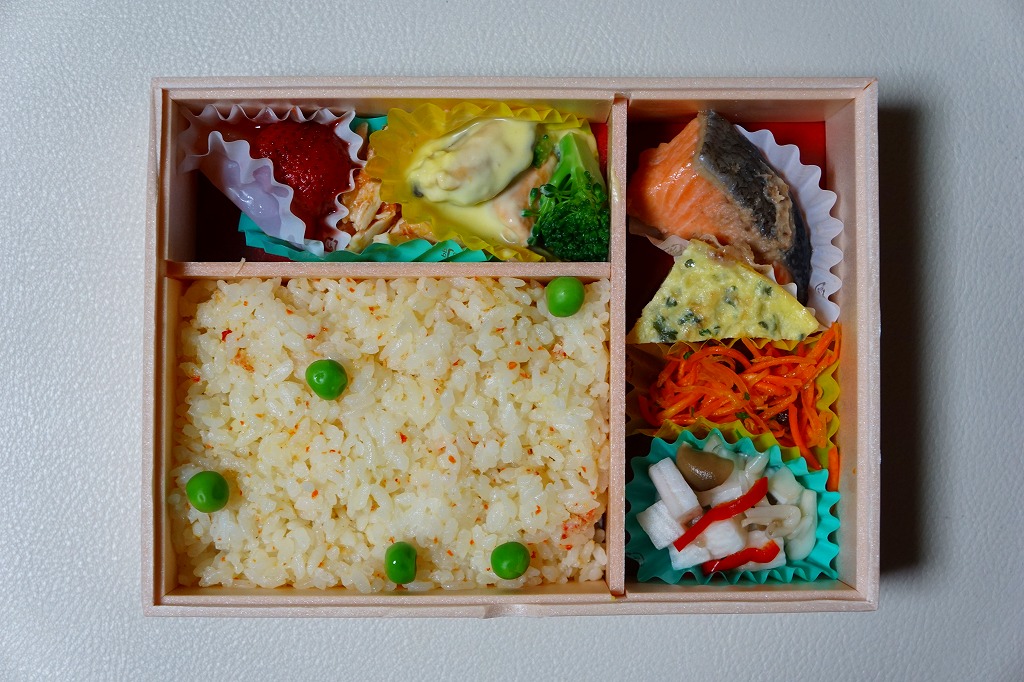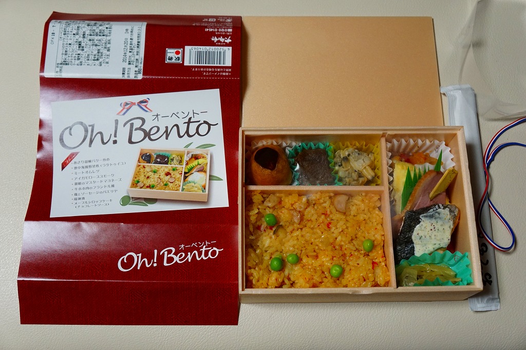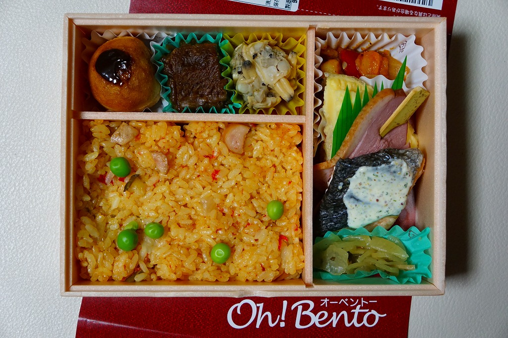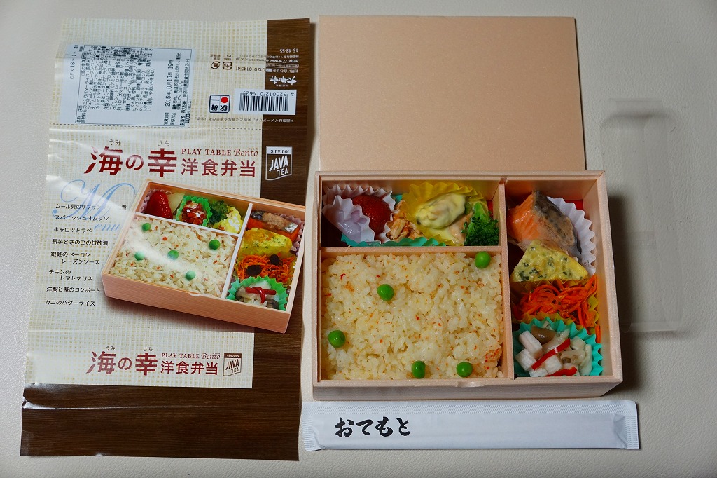掛紙に写真とお品書きで載る中身は、カニのバターライス、銀鮭のベーコンレーズンソース、スパニッシュオムレツ、キャロットラペ、ナガイモとキノコの甘酢漬、ムール貝のサフランクリーム煮、チキンのトマトマリネ、洋ナシとイチゴのコンポートなど。味付飯に鮭塩焼や玉子焼などという駅弁を、最新の洋食に仕立てた感じ。今回も昨年と同じく、大船駅の駅弁屋の調製とは思えないような薄味の洋食だった。前年は2種が一度に出たが、今回は後にもう1種が出るそうな。