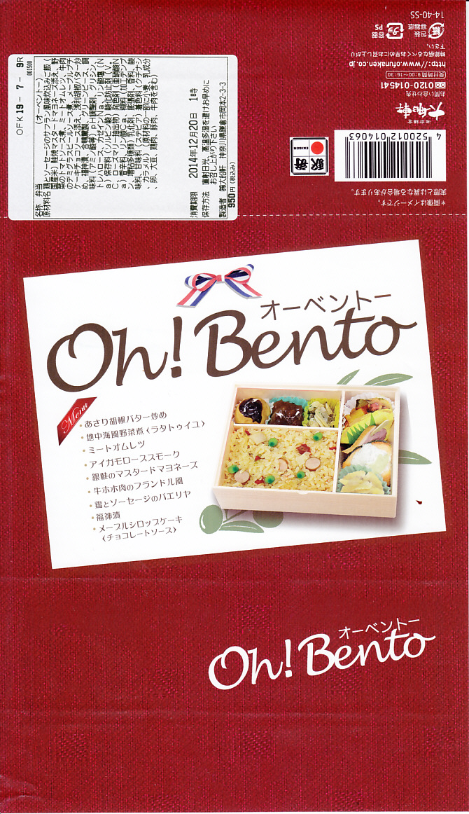 2014(平成26)年12月から翌月頃まで、東京駅で販売か。掛紙に記されたお品書きのとおり、四角い容器に鶏とソーセージのパエリアを詰め、あさり胡麻バター炒め、地中海風野菜煮、ミートオムレツ、アイガモローススモーク、銀鮭のマスタードマヨネーズ、牛ホホ肉のフランドル風、福神漬、メープルシロップケーキを添える。