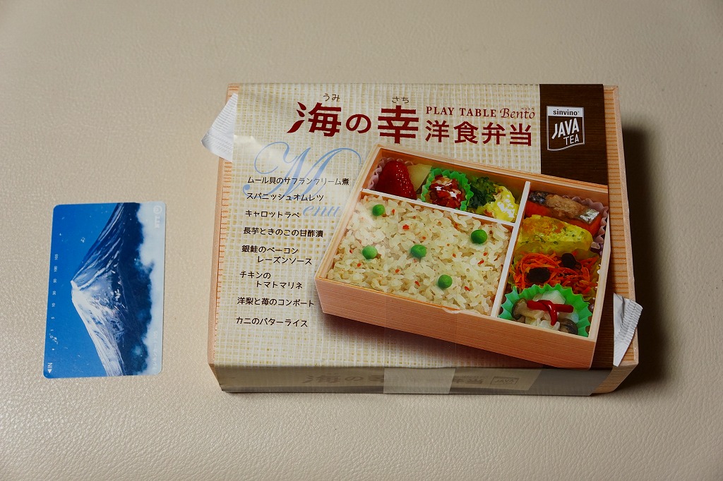 大塚食品と日本レストランエンタプライズ(NRE)と大船軒とのコラボレーション駅弁「PLAY TABLE Bento」の一種で、2016(平成28)年1月から3月までの販売か。以下の第2弾「海の幸洋食弁当」の発売発表時に、もう1種類の発売が予告されていたものの実物で、第2弾の第4種類目といえるだろうか。容器や意匠と、「シンビーノ ジャワティストレート」500mlペットボトルの赤または白が1本付いてくることは同じ。
