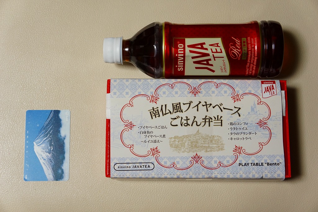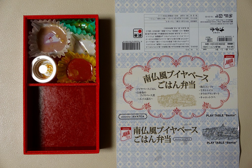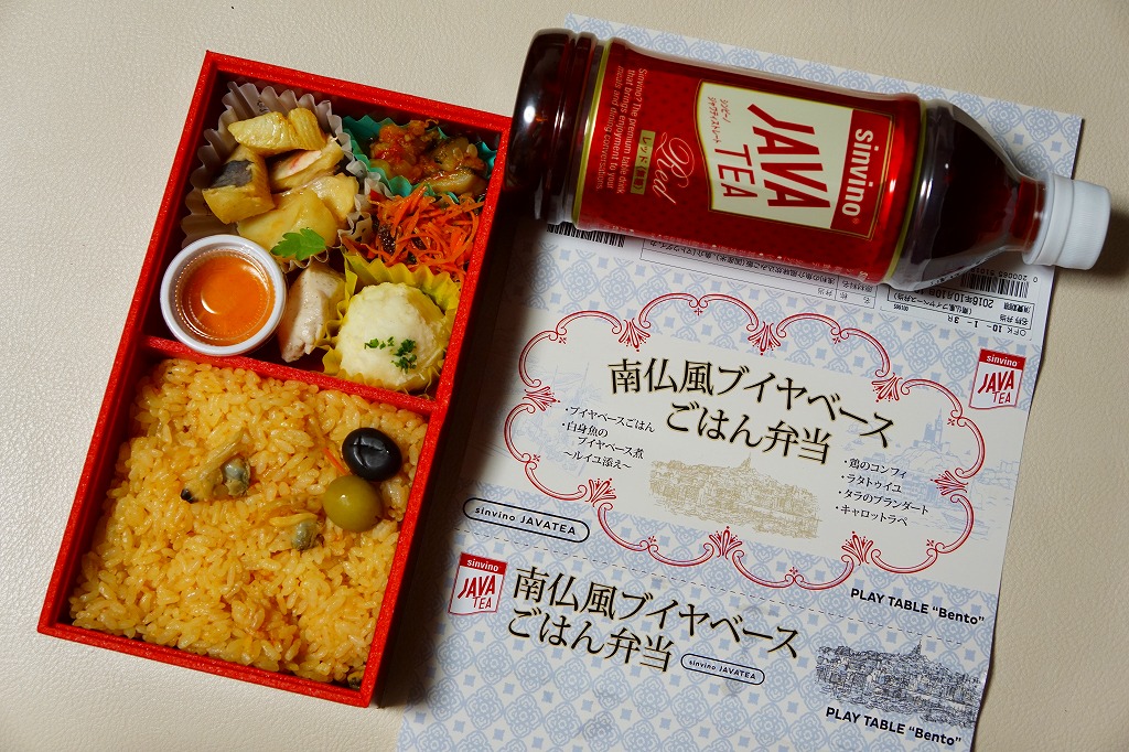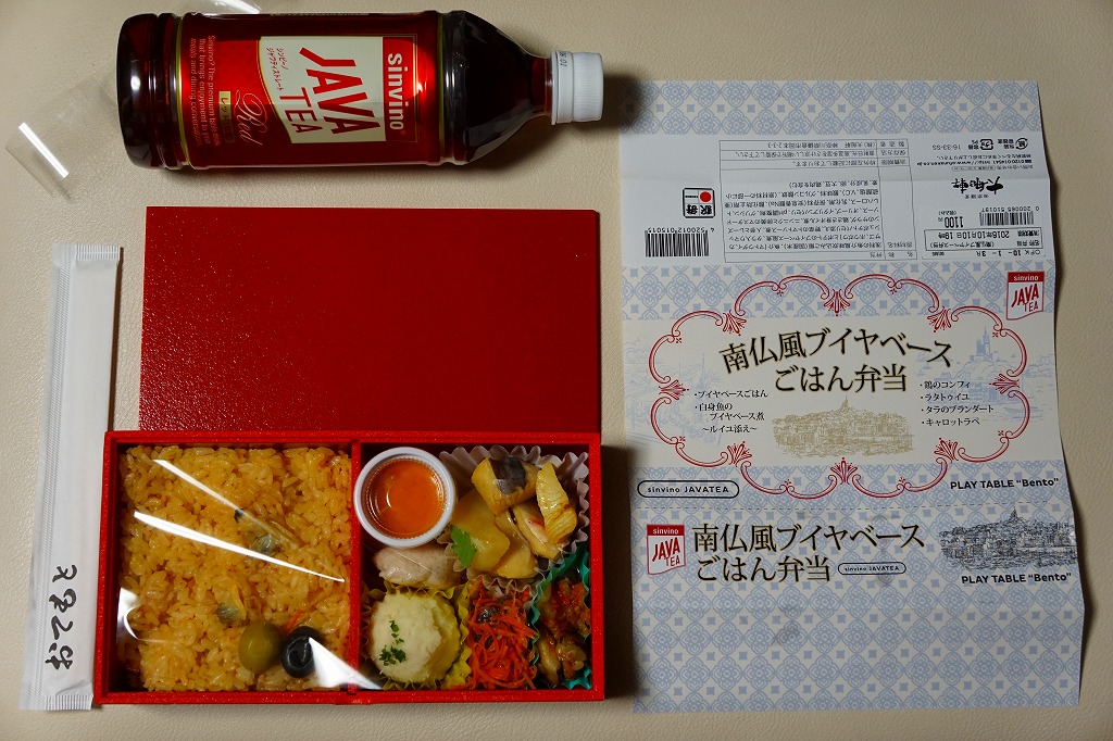 赤い容器の左半分にブイヤベースごはん、右半分に白身魚のブイヤベース煮、鶏のコンフィ、ラタトゥイユ、タラのブランダート、キャロットラペ。聞き慣れない品々が掛紙に記される、淡い魚介類の香りと味がする貝飯と白身魚など。引き続き「JAVATEA」の白か赤の500mlペットボトルを1本添付。買い手を選ぶと思う、他の駅弁にない個性的な中身と味だった。ブイヤベースとは南フランスの郷土料理で、白身魚などの魚介類と野菜などの煮込み料理。