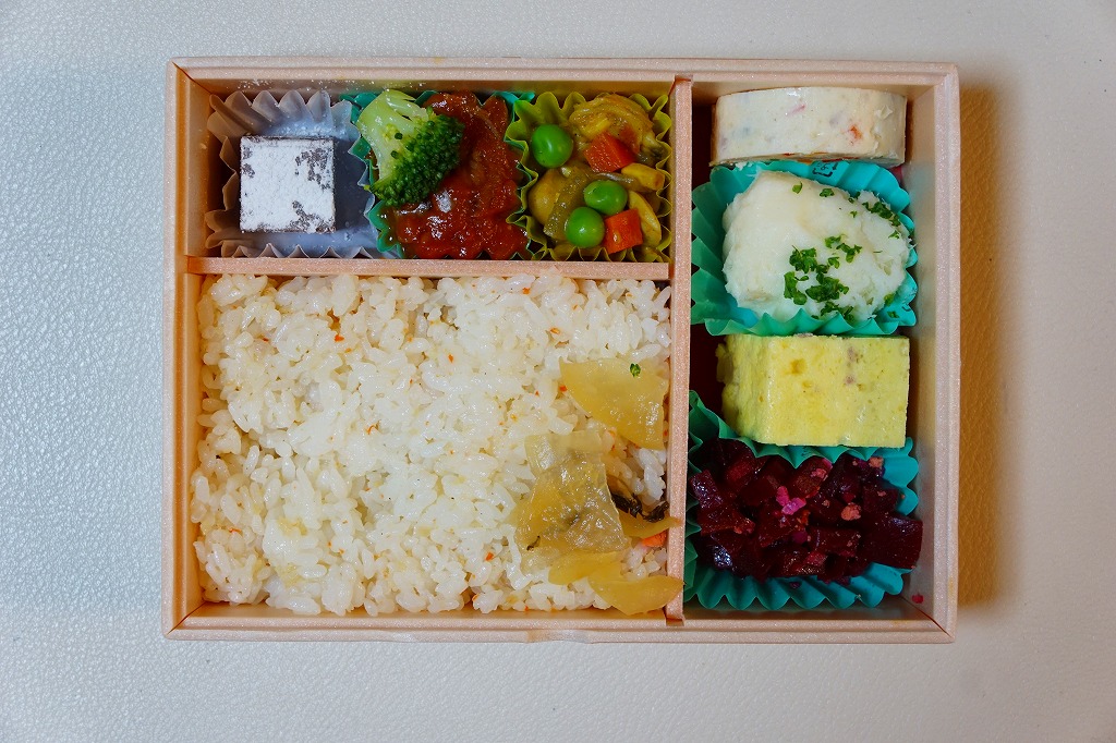 中身は掛紙に記されるとおり、人参と鶏のバターライス、野菜とチャーシューのパテ、豆とハムのオムレツ、ビーツサラダ、野菜とあさりのココナッツカレー、ポテトとタラのブランダード、牛肉のトマト煮、小豆とチョコレートのデザート、福神漬。バターライスに野菜を使う固め物の各種が添えられていて、弁当でなく料理として食べれば値段が張りそうな美食系。千円ちょうどで買えることが格安に思えた。そうでない雑食系や粗食系では、おかずが足りなくて困る感じ。