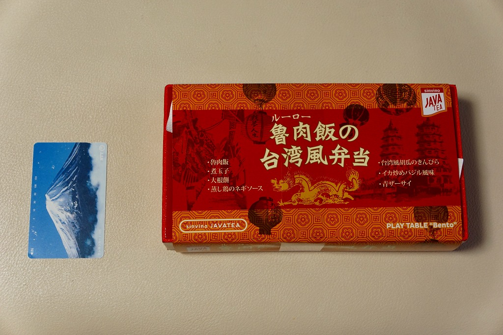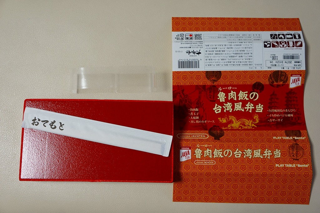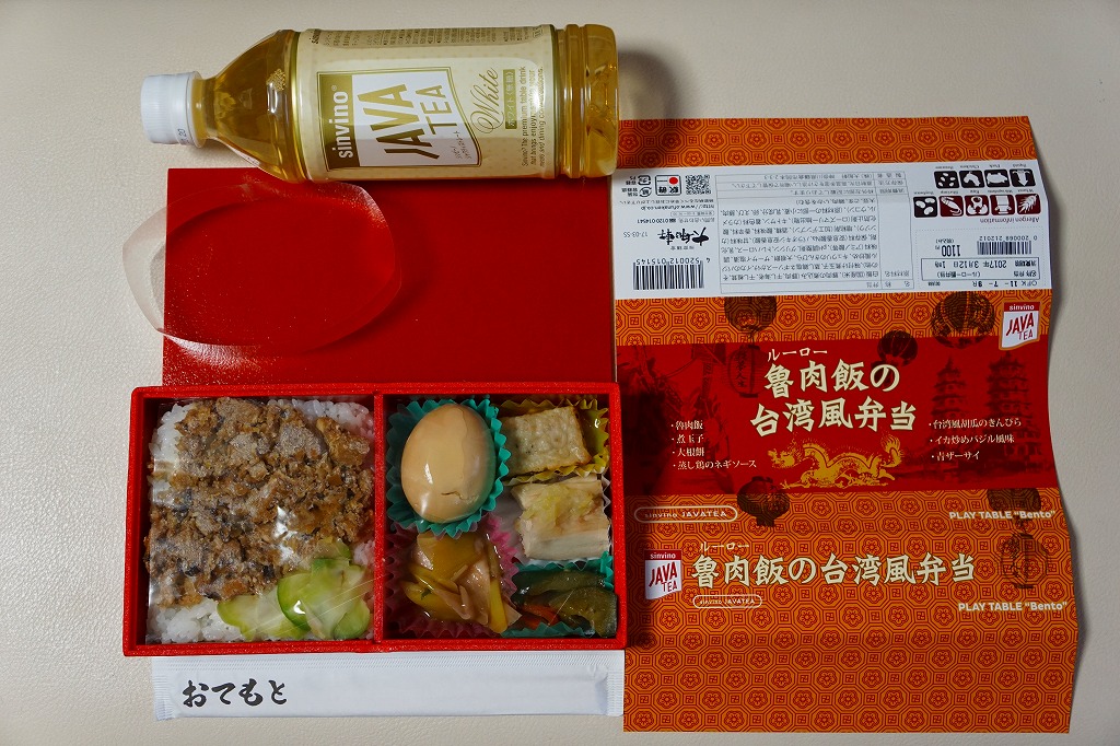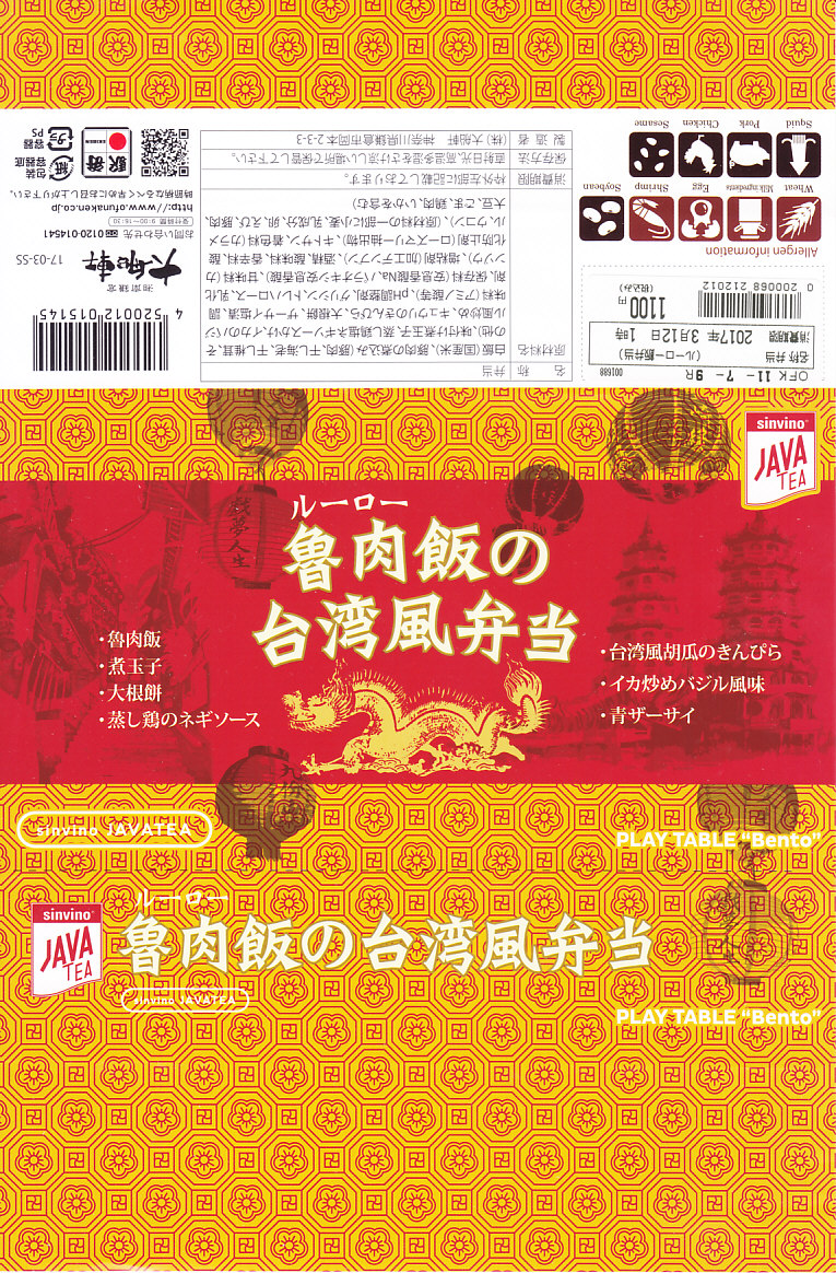 2017(平成29)年1月下旬から3月までの販売か。大塚食品と日本レストランエンタプライズ(NRE)のコラボレーション駅弁「PLAY TABLE Bento」の、2014年からの4年目の、「南仏風」に続く第2弾。JAVATEAの白か赤の500mlペットボトルが1本ついてくるのは従前どおり。掛紙は台湾の観光名所である龍虎塔と九[イ分]の風景をシルエットにした赤と黄色のデザイン。