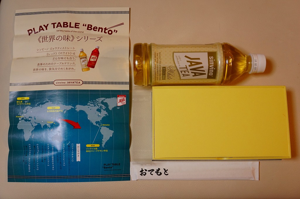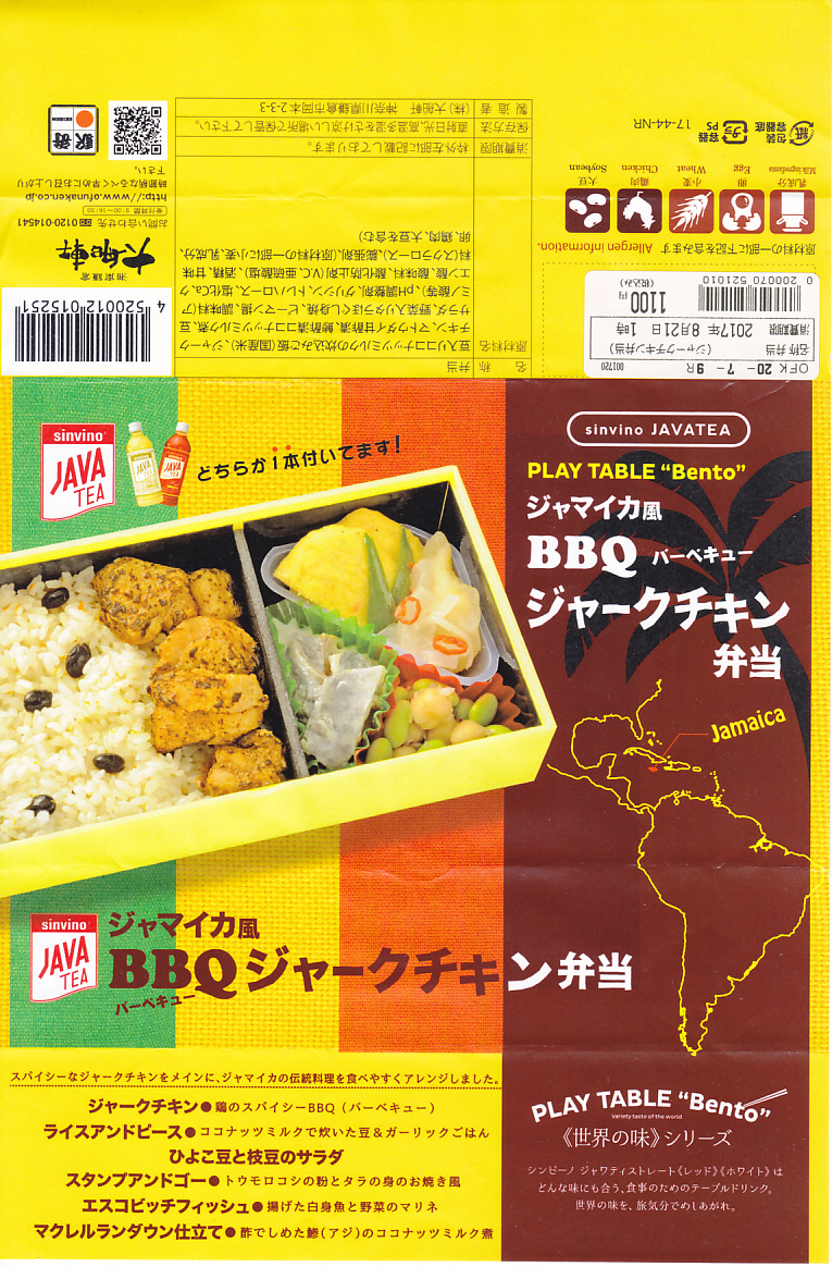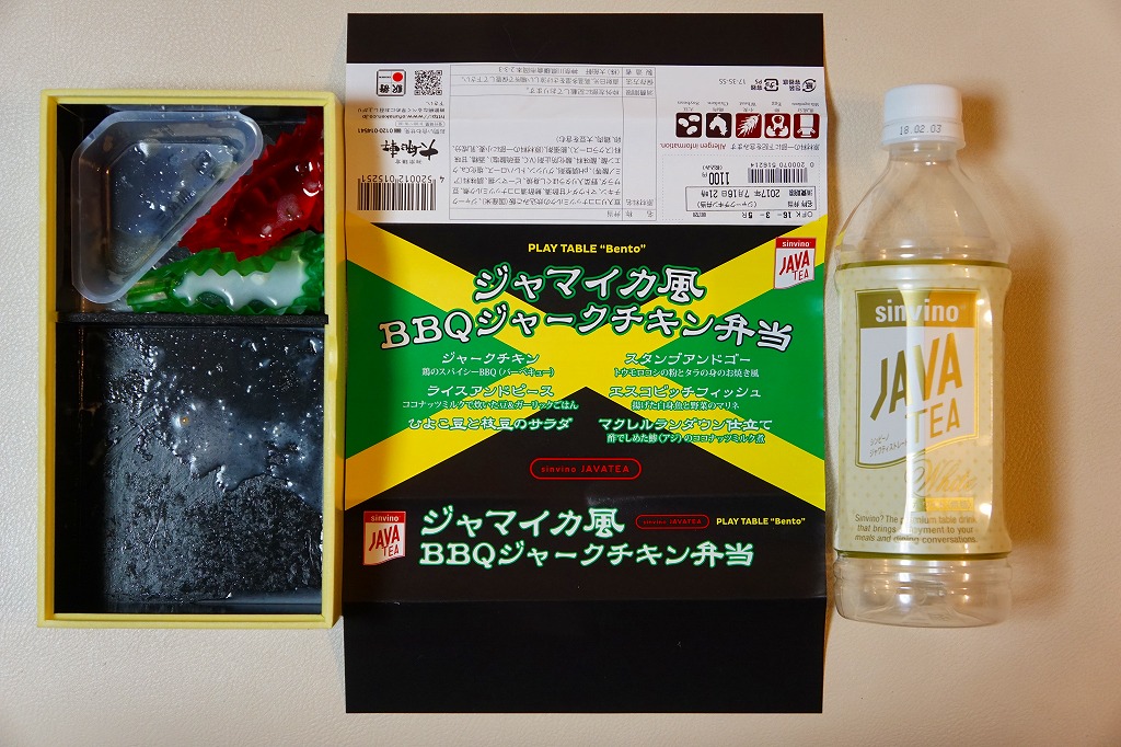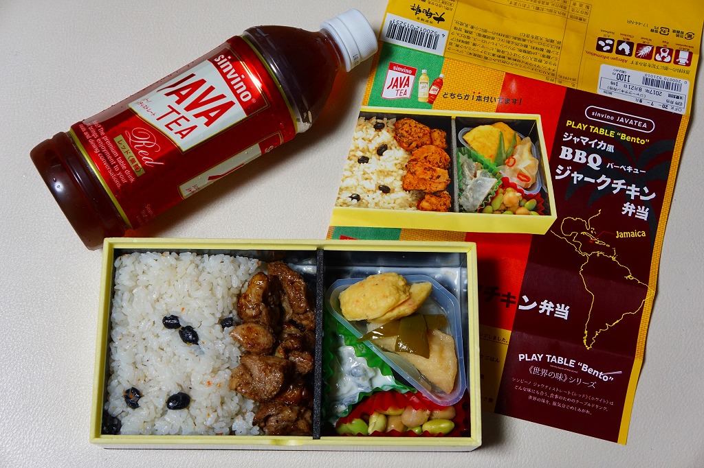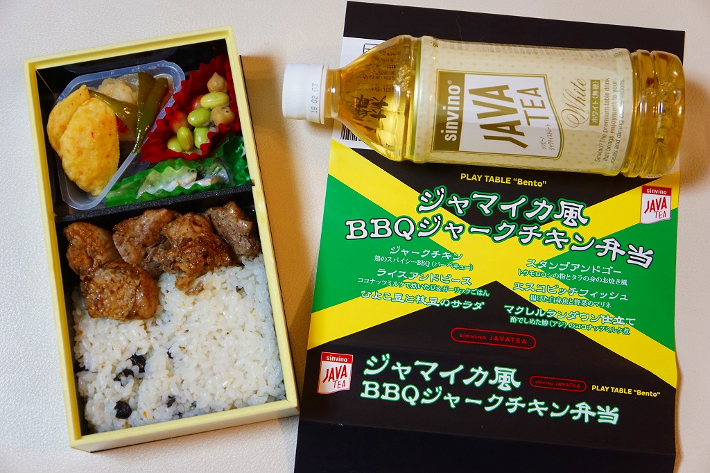 2017(平成29)年7月1日から12,000個を販売。大塚食品と日本レストランエンタプライズ(NRE)のコラボレーション駅弁「PLAY TABLE Bento」の、2014年からの4年目の、「南仏風」「台湾風」に続く第3弾。JAVATEAの白か赤の500mlペットボトルが1本ついてくるのは従前どおり。掛紙はジャマイカの国旗に、お品書きを書いたデザイン。
