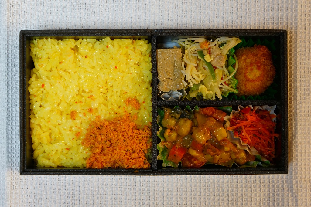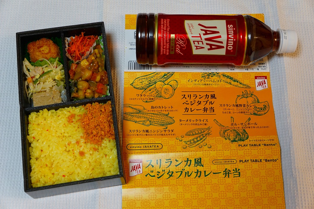 中身は「ターメリックライス(ターメリックの炊込みご飯)」「ポル・サンボール(ココナッツとカツオ、玉ねぎ等で作ったふりかけ)」「スリランカ風野菜カレー(ズッキーニ、ニンジン、トマト、ひよこ豆、コーンの野菜カレー)」「インディアッーパムコトゥ(スリランカ風焼きビーフン)」「魚のカトレット(カツオとジャガイモのコロッケ)」「スリランカ風ニンジンサラダ(ニンジンをクミン等のスパイスで和えたサラダ)」「ワタラッパン(ココナッツミルクと黒糖のプリン」とのこと。相変わらず、駅弁では珍しいエスニックな香りまたは臭いが漂う。