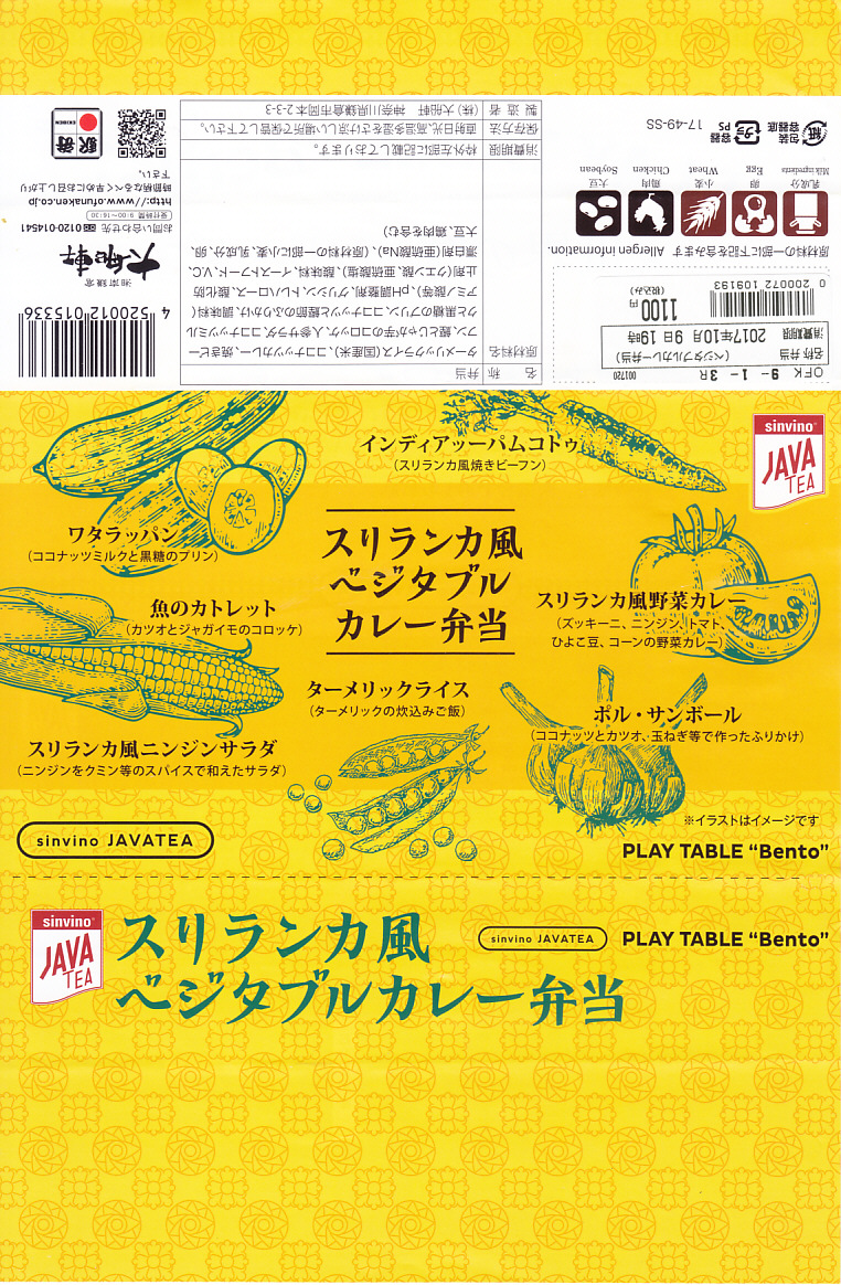 2017(平成29)年9月21日の発売。大塚食品と日本レストランエンタプライズ(NRE)のコラボレーション駅弁「PLAY TABLE Bento」の、2014年からの4年目の、「南仏風」「台湾風」「ジャマイカ風」に続く第4弾。JAVATEAの白か赤の500mlペットボトルが1本ついてくるのは従前どおり。掛紙はお品書きと食材のイラストを描いたターメリック色。