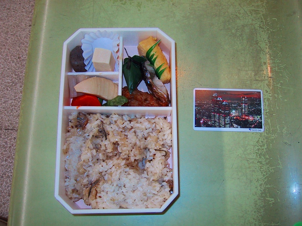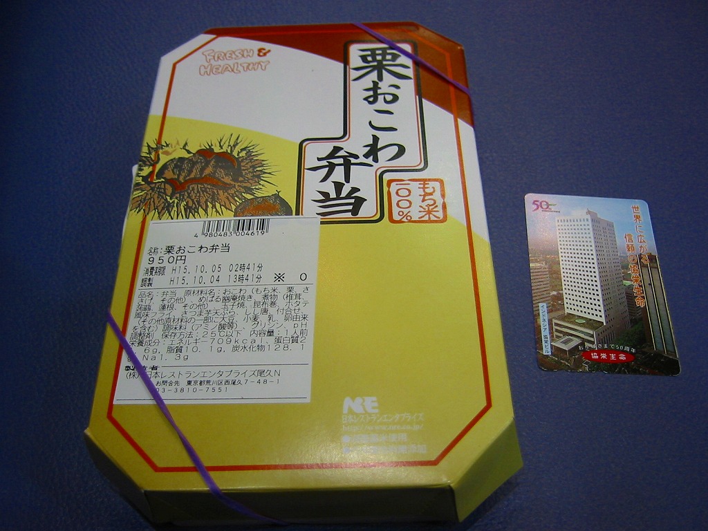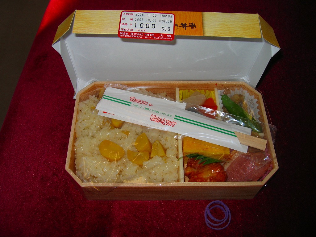 NREの季節のおこわ弁当の、2008(平成20)年の秋バージョン。角を落とした長方形の容器に、栗を描いたボール紙のふたをかける。中身は栗片がごろごろ入るおこわと、肉詰めシイタケなどの煮物、ホキ揚げ浸し、ししとう、イカすり身揚げ、合鴨ロース、玉子焼、なめこなど。下記の2003年のものと違い、常温なのにもちっと柔らかいおこわに、大きさと分量と色彩と見栄えが整ったおかずをきれいに詰めた、都会でおいしい機能的な秋の味。千円の栗飯という値段を考えると、もうひとつなにか欲しくなるが。