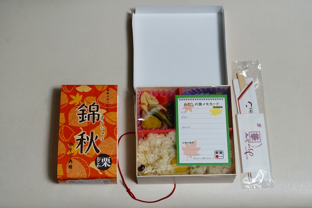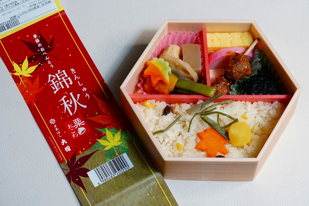 2021(令和3)年9月1日に東京、品川、新宿、上野、八王子、大宮の各駅で発売。20年以上続いた季節の駅弁「栗おこわ弁当」に代わり、9月から11月まで東京で売られる、駅やデパ地下のお弁当。正六角形の容器を3つに仕切り、半分に黒豆やニンジンなどで彩るささげ入栗おこわを、残りの半分にカボチャやこんにゃくやがんもなどの煮物を、残りに蒲鉾と玉子焼と鶏つくねとひじき煮を詰める。分量と構成と品質が確保された、東京では貴重な、1,000円でお釣りが来る駅弁。