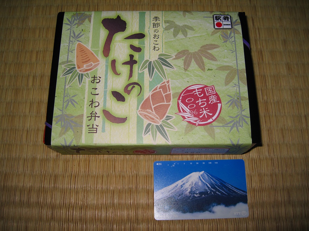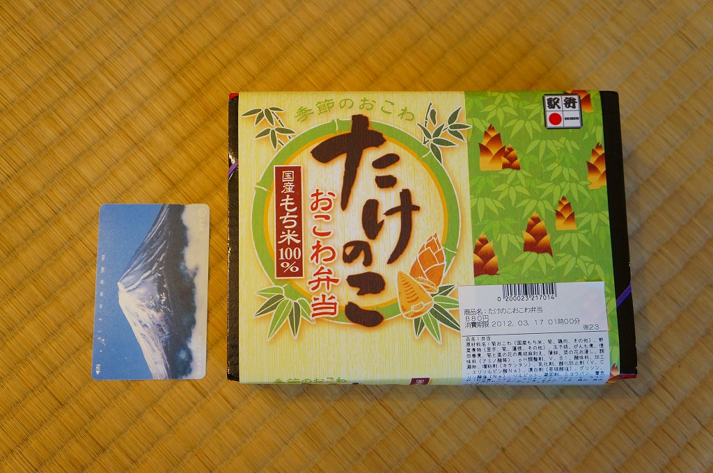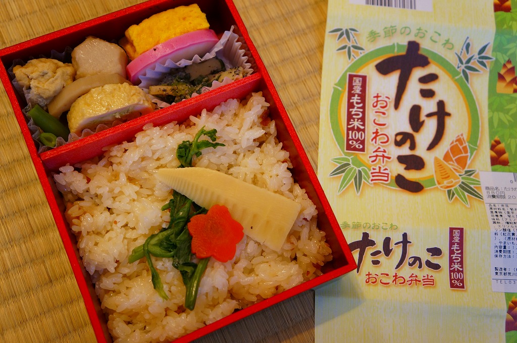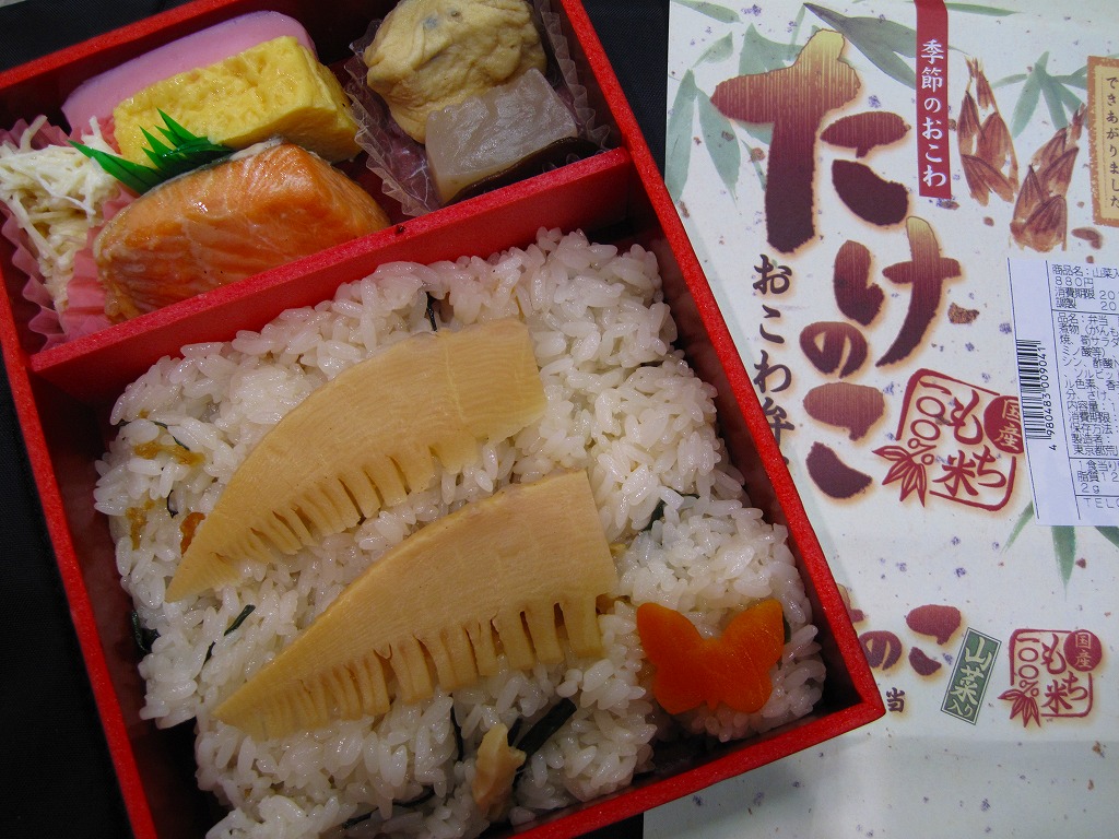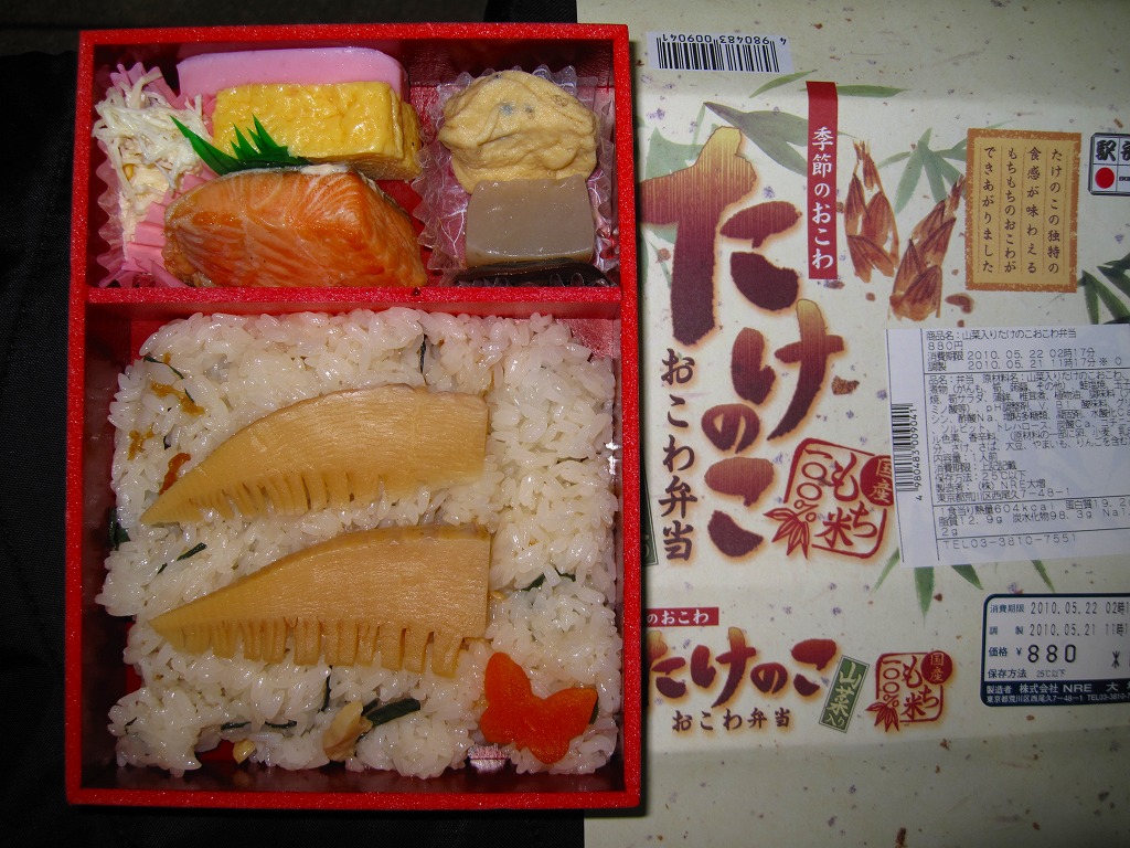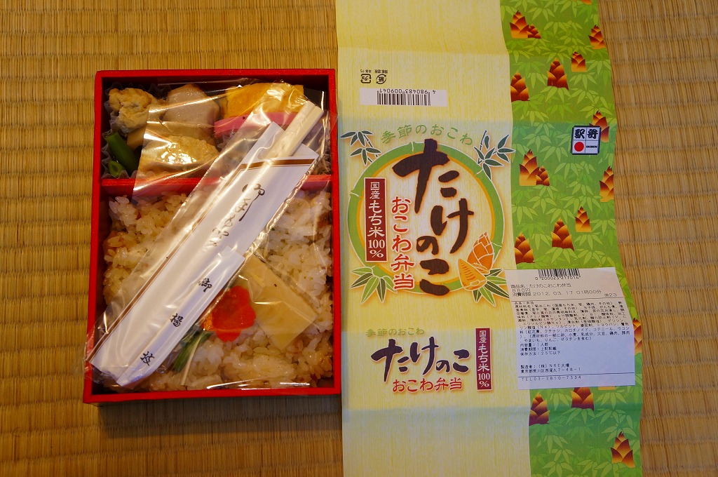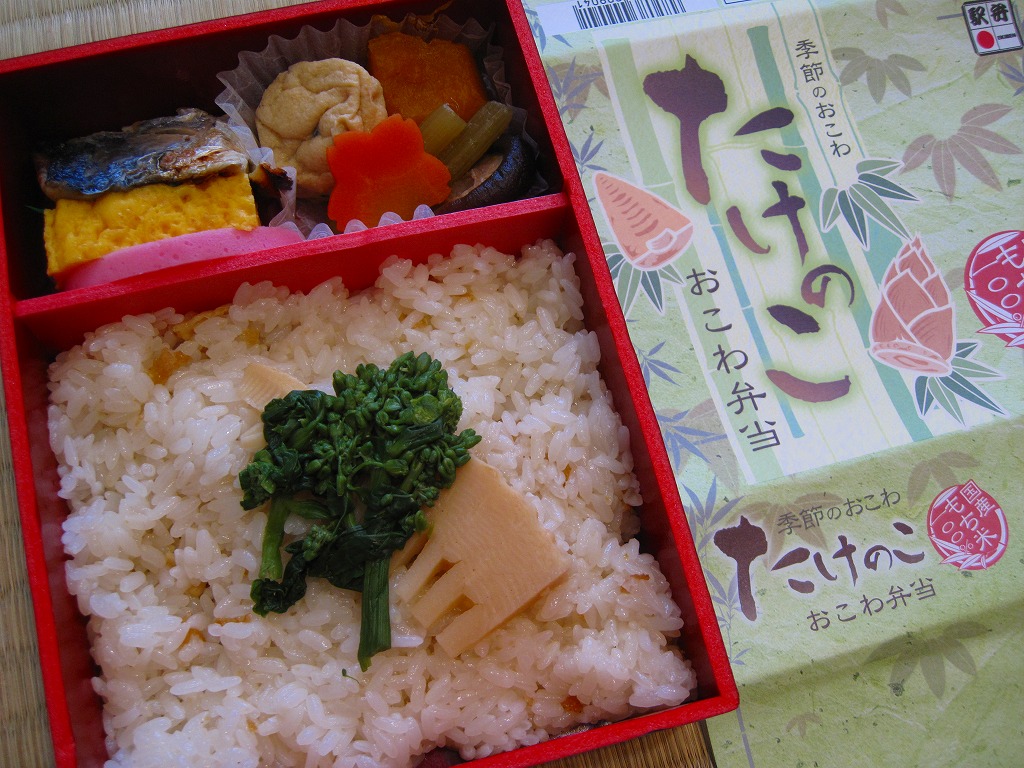下記の駅弁「たけのこおこわ弁当」の2010年の春バージョンで、見てのとおり今回は大きくリニューアル。黒塗りの赤い容器を使用、駅弁の名前などを描いた淡い緑色の掛紙を巻く。中身は山菜入りたけのこおこわに、かまぼこ、玉子焼、鮭塩焼、こんにゃくなどの煮物、たけのこサラダ。おかずがシンプルになり、しかし幕の内駅弁の定義に合うレベルでは残り、しかし価格が120円下がり、メインのおこわがよりふっくらもちっとなったのではと思う。