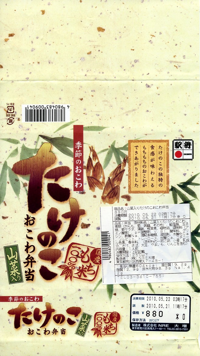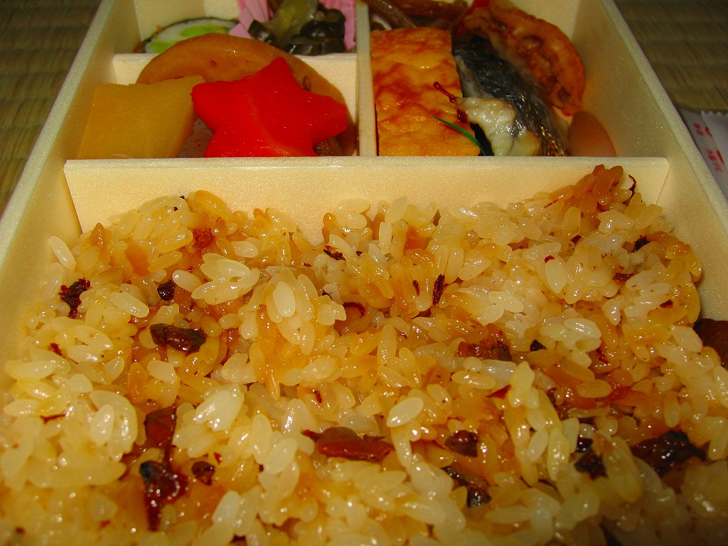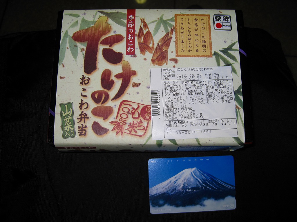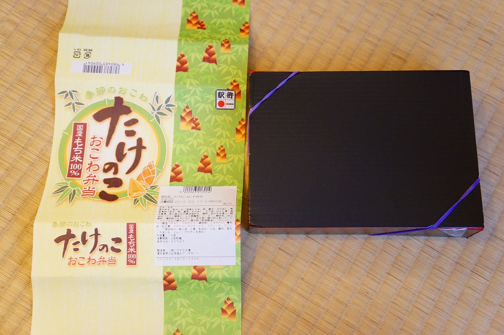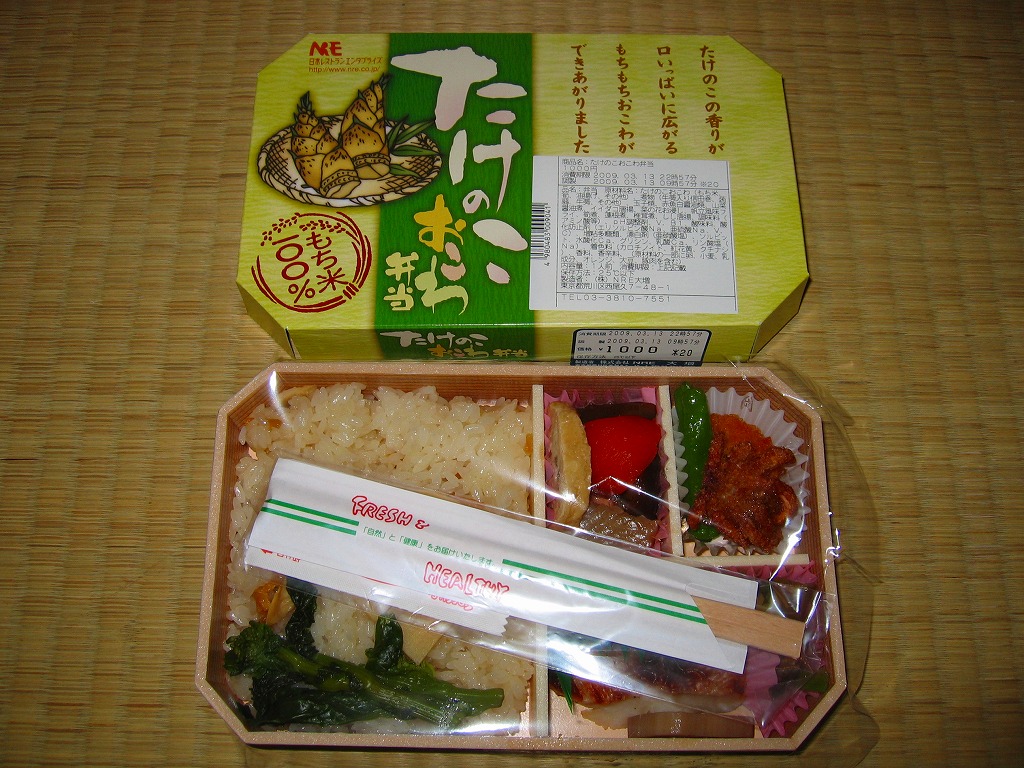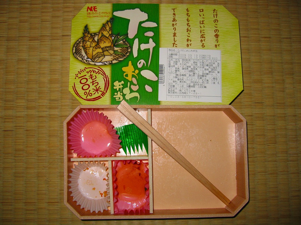 下記の駅弁「たけのこおこわ弁当」の2010年の春バージョンで、見てのとおり今回は大きくリニューアル。黒塗りの赤い容器を使用、駅弁の名前などを描いた淡い緑色の掛紙を巻く。中身は山菜入りたけのこおこわに、かまぼこ、玉子焼、鮭塩焼、こんにゃくなどの煮物、たけのこサラダ。おかずがシンプルになり、しかし幕の内駅弁の定義に合うレベルでは残り、しかし価格が120円下がり、メインのおこわがよりふっくらもちっとなったのではと思う。