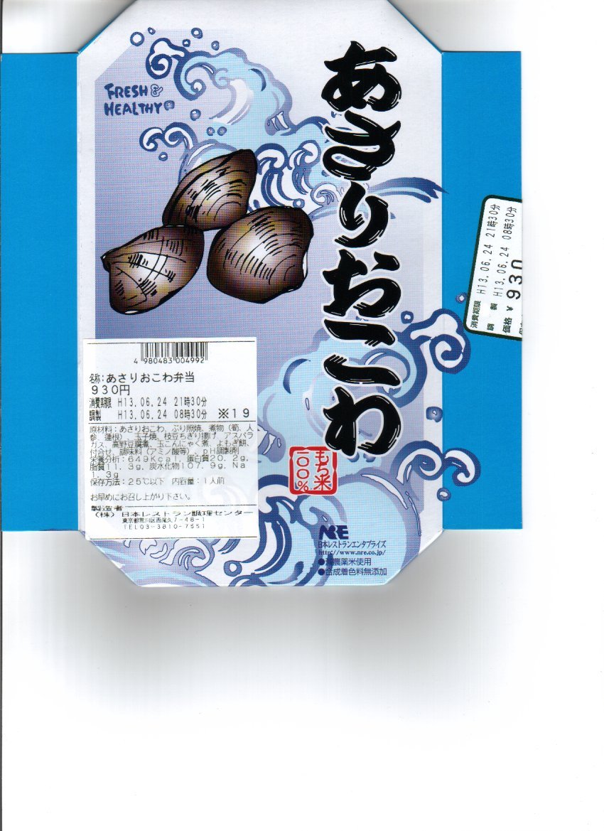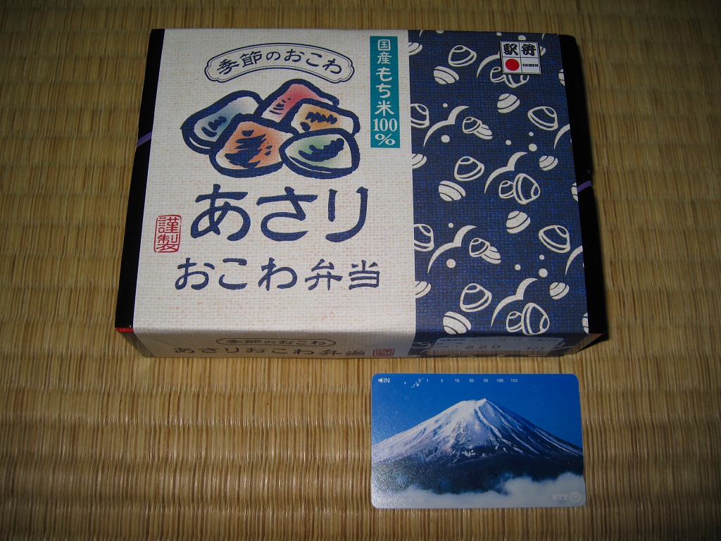 下記の駅弁「あさりおこわ」の2005年版で、6月中旬から9月中旬までの季節販売。2001年のものと比較して形状や中身にほとんど変化はないが、今回は品質が格段に向上した感じで、主役のあさりおこわにアサリの風味と適度な柔らかさを感じたし、容器内の空間も偏りがない。デジカメの性能も向上したので、写真の見栄えも良い。