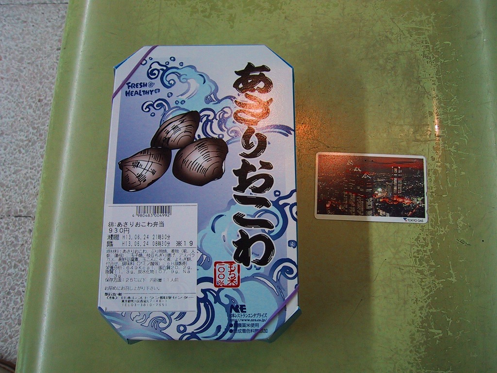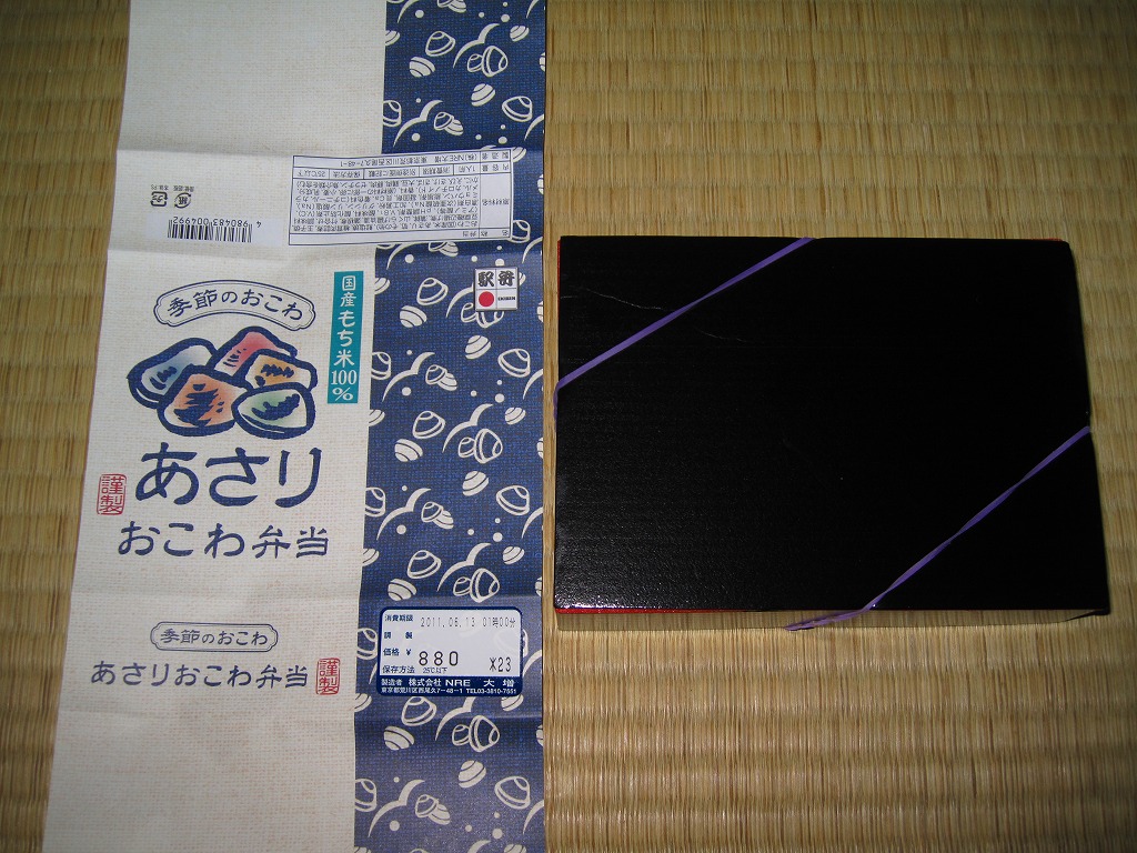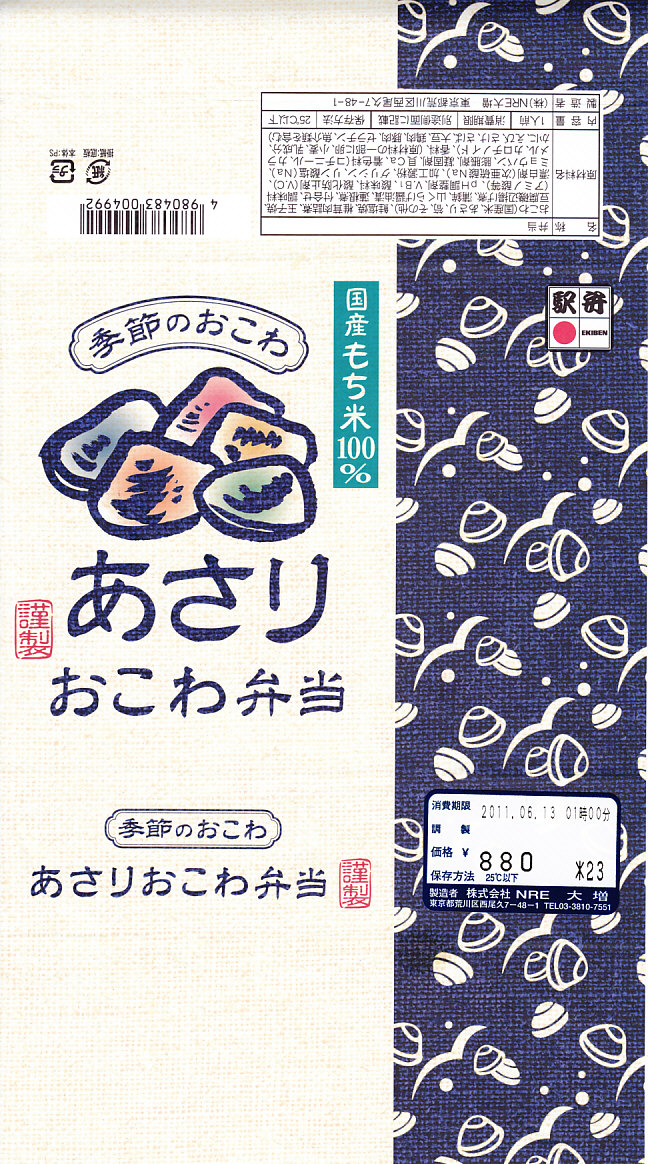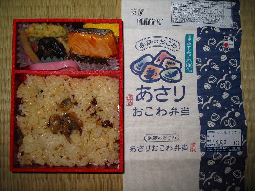 NREの首都圏エリアの、季節のおこわ弁当の2011年の夏バージョン。春と同じ容器と価格で、中身はあさりおこわに鮭塩焼、シイタケ肉詰、玉子焼、かまぼこ、豆腐の磯部揚などを添えるもの。引き続き東京駅弁としては安価なのにやわらかくおいしい駅弁であり、今回は豆腐磯部揚煮と椎茸肉詰煮の食感が高級な感じ。