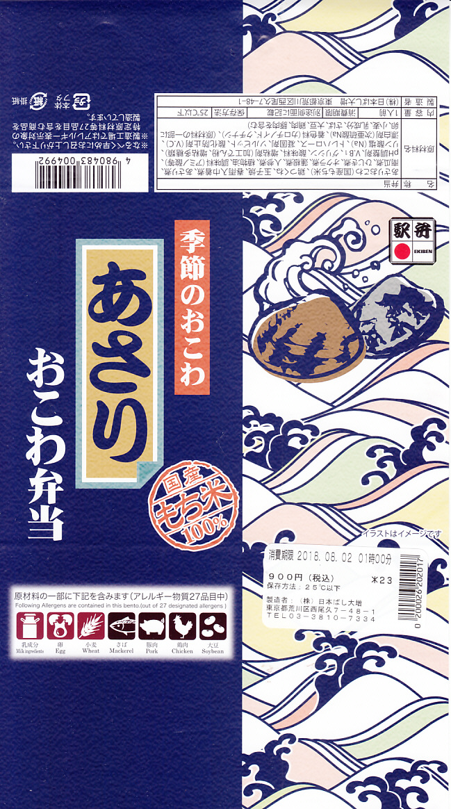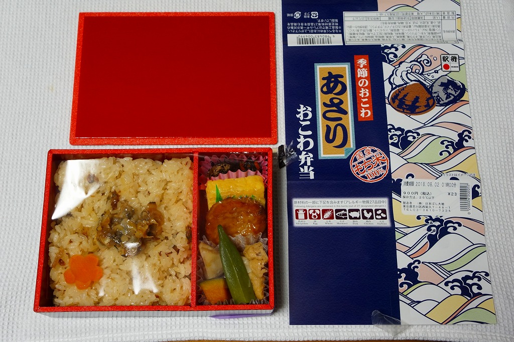 1990年代の発売。現在は東京、品川、新宿、上野、大宮の各駅で、毎年6月から8月まで販売される、季節のおこわ弁当の夏版。これは2020(令和2)年のもの。中身はあさりおこわ、玉子焼、野菜入りつくね串、カボチャやサトイモなどの煮物、かまぼこと玉子焼、きのこ柚子和え。内容は毎年ほぼ同じでも、掛紙の絵柄は毎年変わっている。今の東京の駅弁の中では、うまいわりに高くない、コスパが高いものだと思う。価格は2010年から880円、2014年から900円、2019年から930円。2021年シーズンまでの販売か。