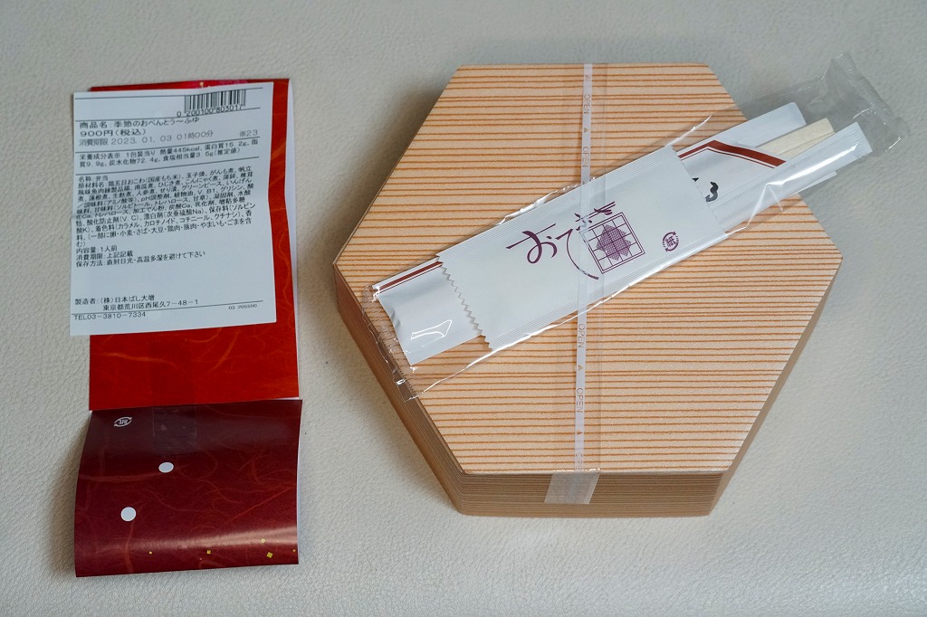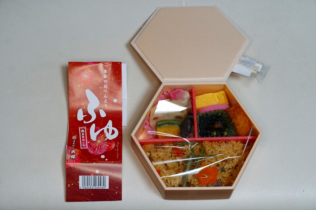 2021(令和3)年の12月頃に発売か。10年以上続いた季節の駅弁「ほたておこわ弁当」「鮭いくらおこわ弁当」に代わり、12月から2月まで東京で売られる、駅やデパ地下のお弁当。正六角形の容器を3つに仕切り、半分に鶏五目おこわを、残りの半分にカボチャやれんこんやがんもなどの煮物を、残りに蒲鉾と玉子焼とホタテ風フライとひじき煮を詰める。分量と構成と品質が確保された、東京では貴重な、1,000円でお釣りが来る駅弁。翌シーズンの2023年12月から2024年1月までは、御飯が赤飯になった。2024年12月に「季節のおべんとう鶏五目おこわ」へリニューアル。