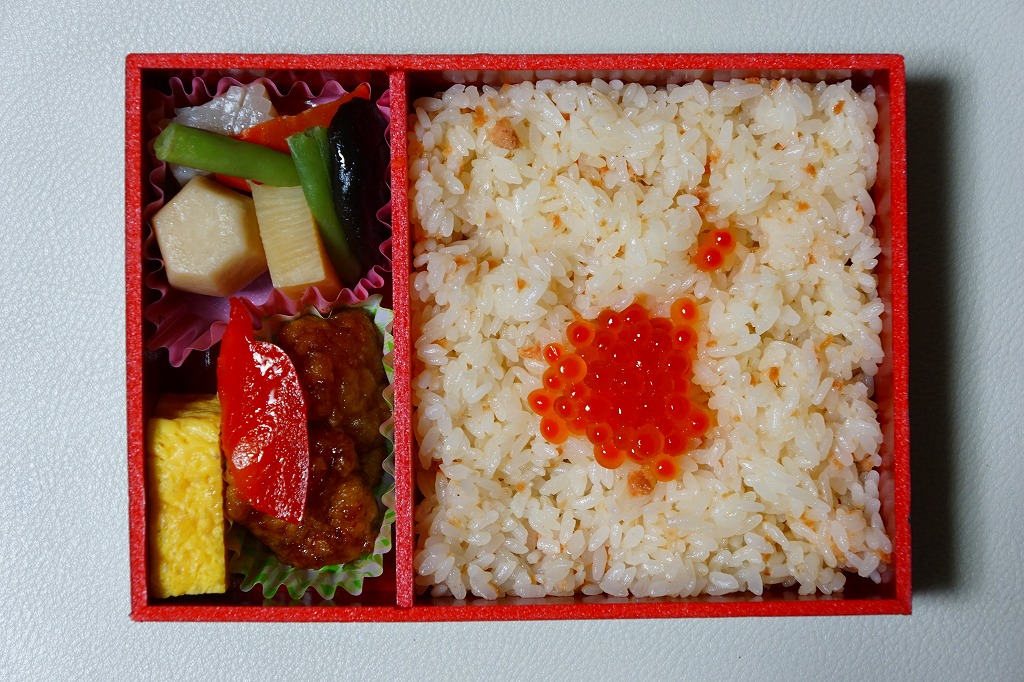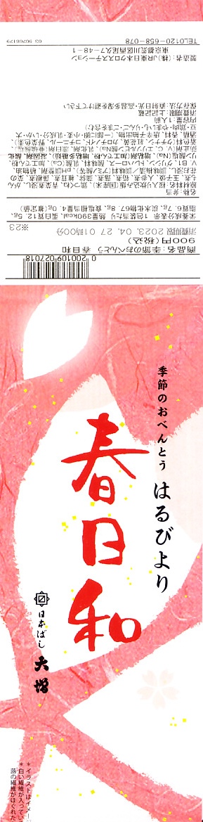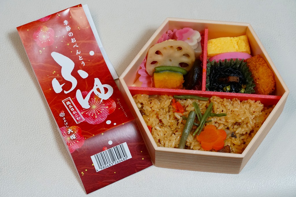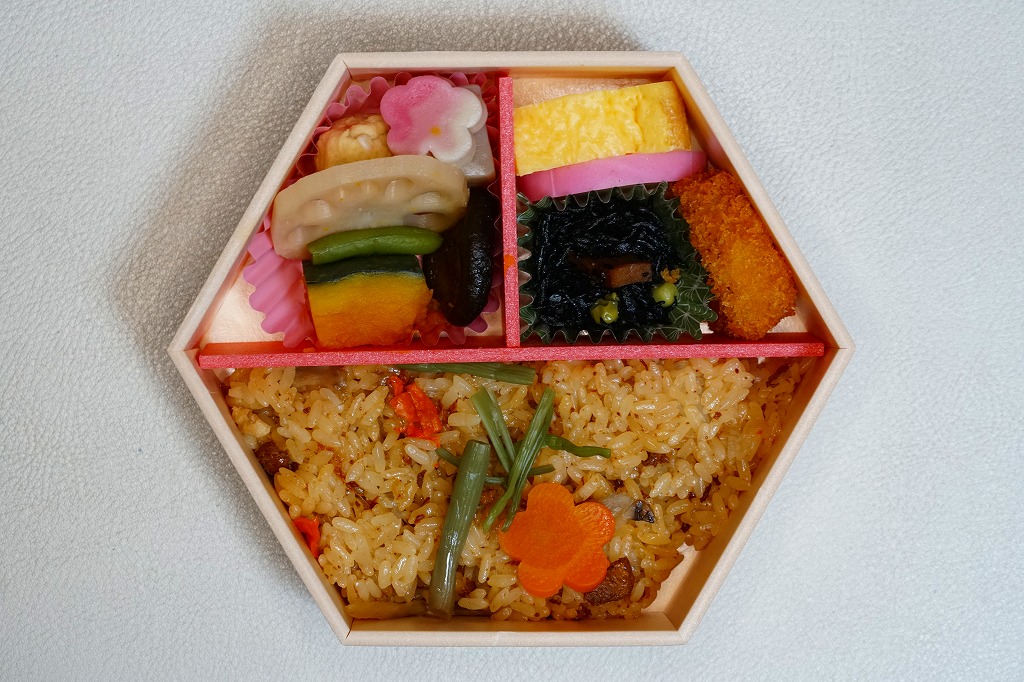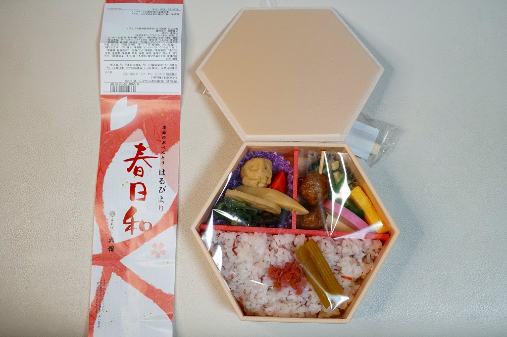 2021(令和3)年の春に初めて販売か。その年には併売した、20年以上続いた季節の駅弁「たけのこおこわ弁当」に代わり、3月から5月まで東京で売られる、駅やデパ地下のお弁当。正六角形の容器を3つに仕切り、半分におこわでない桜入り炊込み飯を、残りの半分にタケノコやニンジンやがんもなどの煮物を、残りに蒲鉾と玉子焼と鶏つくねと菜の花お浸しを詰める。分量と構成と品質が確保された、東京では貴重な、1,000円でお釣りが来る駅弁。調製元は2023年4月から「日本ばし大増」ブランドのJR東日本クロスステーション。