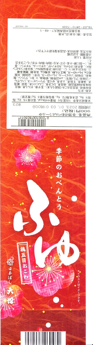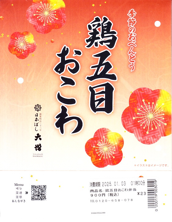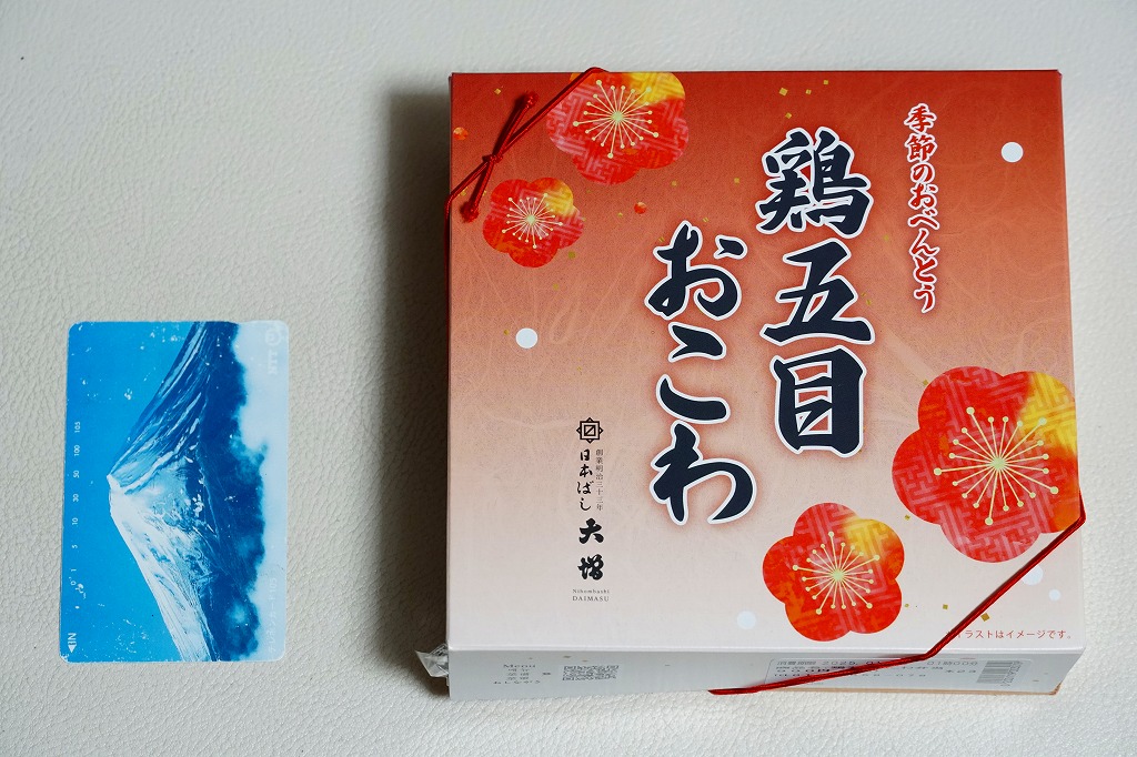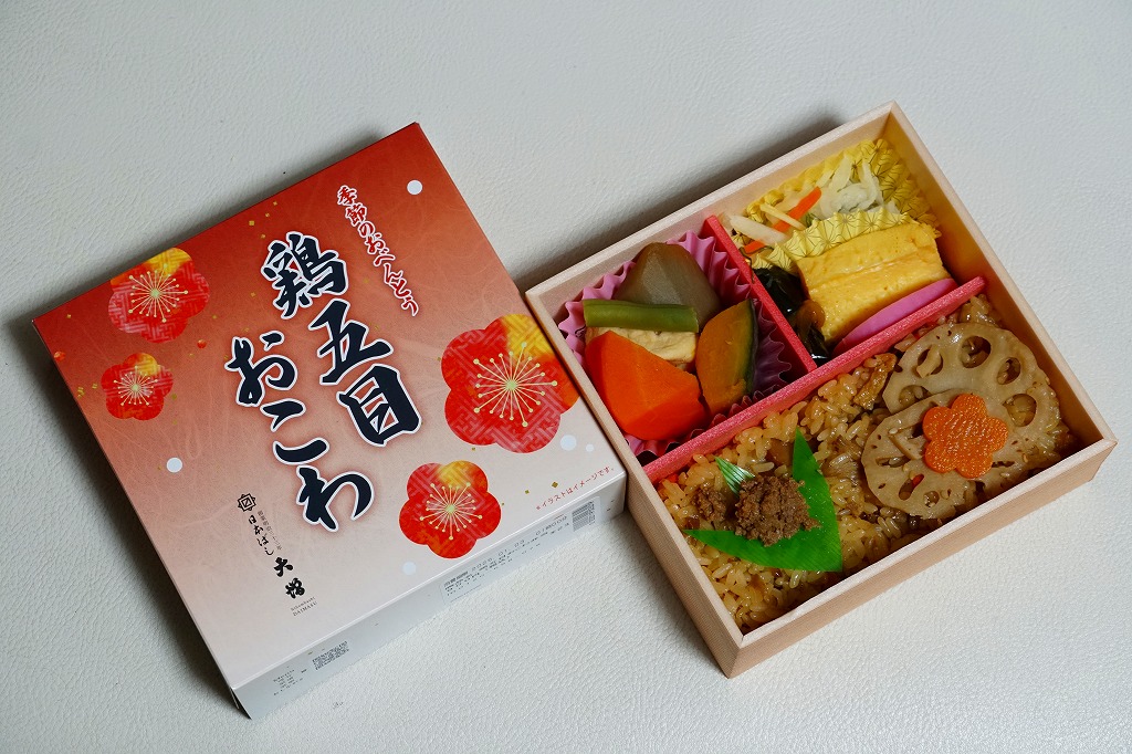 従前の冬季駅弁「季節のおべんとうふゆ」を、2024年12月にリニューアル。正六角形の容器を正方形に変え、商品名を季節から中身に変え、引き続き東京駅弁というよりは「日本ばし大増」ブランドの仕出し弁当かデパ地下弁当の姿をする。中身は鶏五目おこわに花にんじんとれんこんきんぴらと鶏そぼろ味噌味を載せ、かぼちゃやごぼうなどの煮物と、かまぼこ、玉子焼、大根サラダ、にしん昆布巻を添えるもので、これは2年前のものに似ている。この物価高の中で、900円の価格が据え置かれた。安心感と実用的な腹六分目は、下記の秋版と同じ感じ。