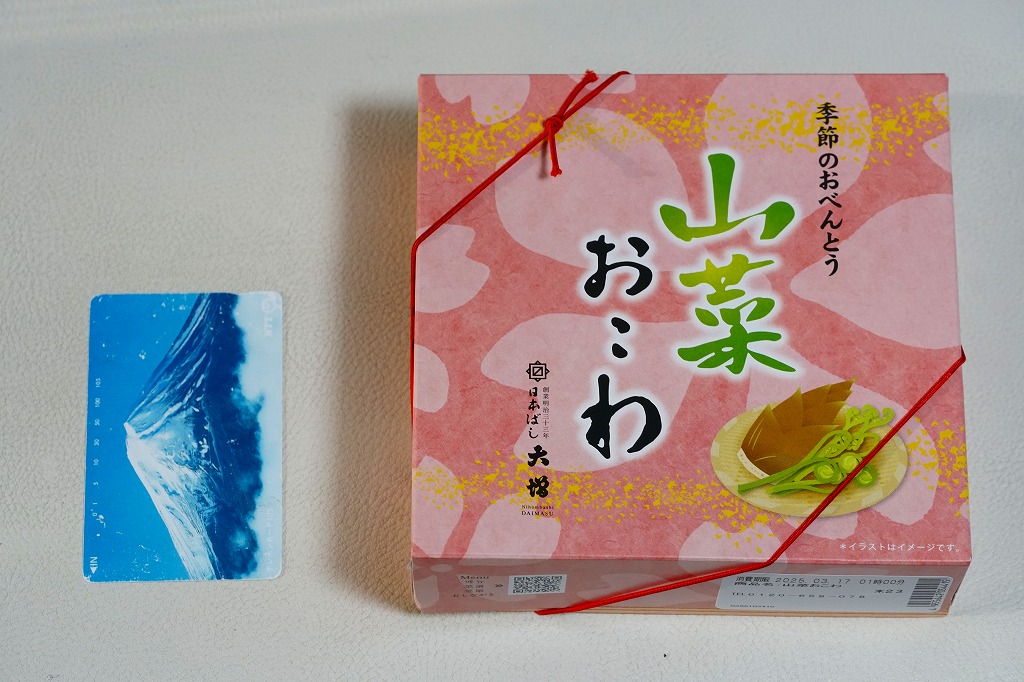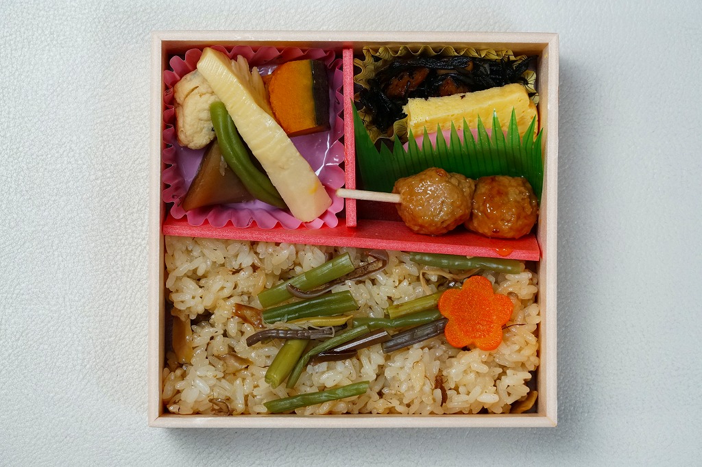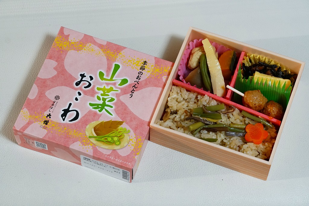 従前の春季駅弁「季節のおべんとう春日和」を、2025年3月にリニューアル。正六角形の容器を正方形に変え、商品名を季節から中身に変え、引き続き東京駅弁というよりは「日本ばし大増」ブランドの仕出し弁当かデパ地下弁当の姿をする。中身は山菜おこわに花にんじんを載せ、かぼちゃやたけのこなどの煮物と、かまぼこ、玉子焼、ひじき煮、鶏つくねを添えるもの。この物価高の中で、千円を切る価格が維持された。安心感と実用的な腹六分目は、下記の冬版と同じ感じ。