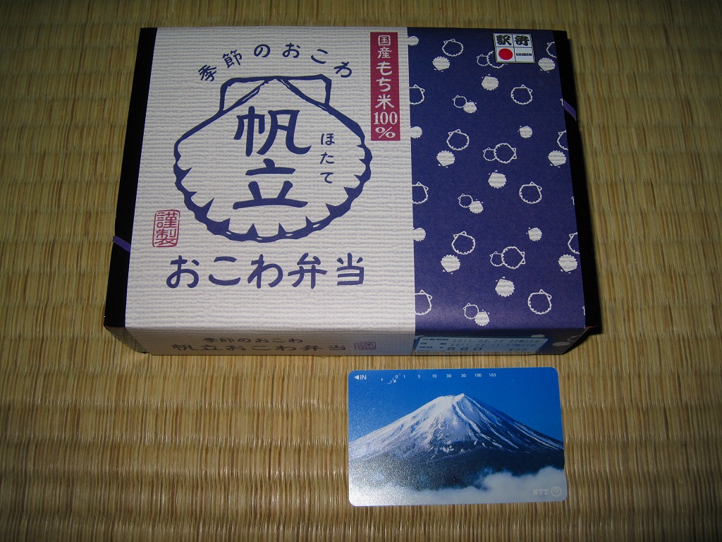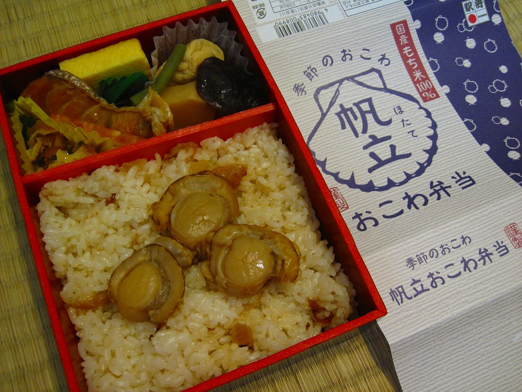冬の駅弁「ほたておこわ弁当」は、2008(平成20)年12月に初登場か。このシリーズで使われるいつもの容器を使用、半分に帆立貝柱やタケノコを混入してベビーホタテ煮2個を載せた、駅弁の名前どおりのほたておこわを詰め、半分はおかずで玉子焼、ニンジンやシイタケなどの煮物、鶏照焼、エビとソラマメのかき揚げ、菜の花など。千円でお釣りが来ないものの、餅米に混入する帆立貝柱の分量を考えると、それなりのもの。幕の内や牛肉弁当よりお得かと言われれば、そうでもなし。
