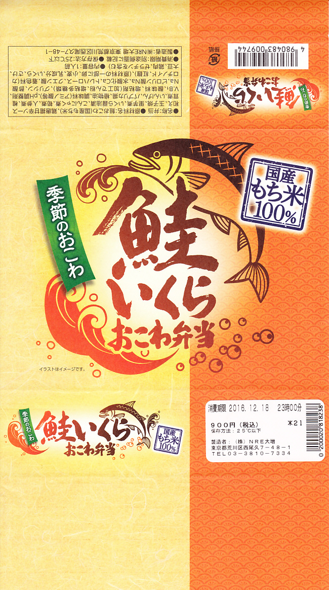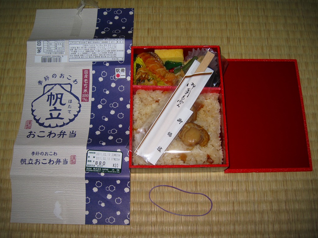 NREの首都圏エリアの、季節のおこわ弁当の2010〜2011年の冬バージョン。2010年の「たけのこおこわ弁当」と同じく、下記の2008年版と比べて大きくリニューアル。黒塗りの赤い容器を使用、掛紙が青と白の冬色になり、中身は煮ホタテを3個置いたほたておこわに鮭塩焼、玉子焼、がんもやタケノコなどの煮物、ホタテのひもとカズノコの和え物など。